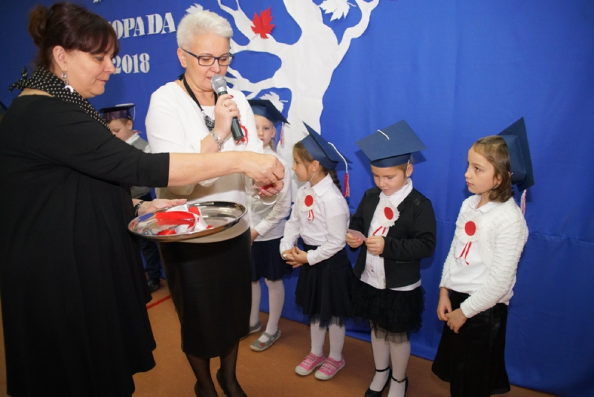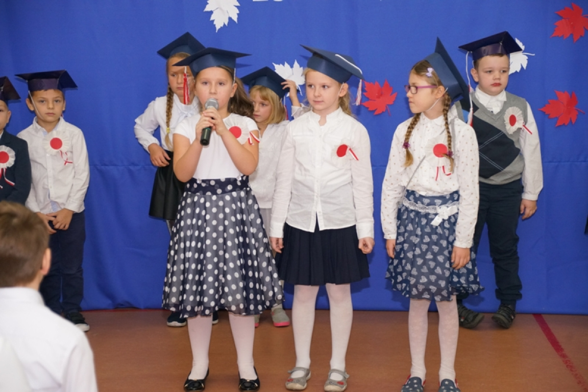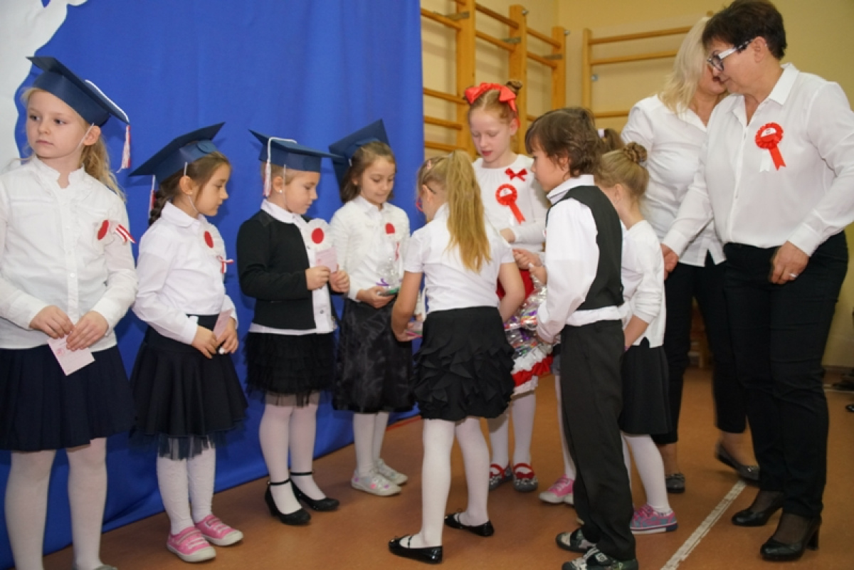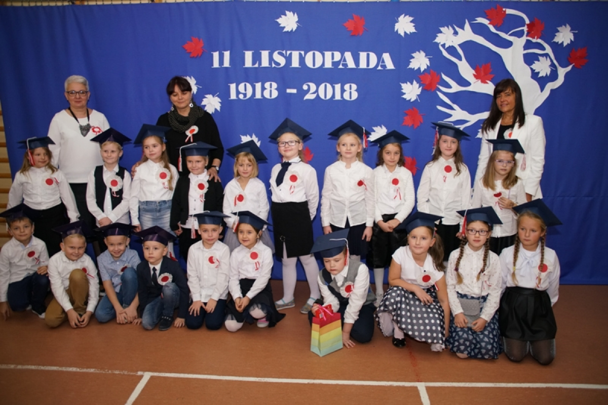Przede wszystkim była to niezwykła lekcja patriotyzmu - „Cieszmy się, że o wojnie i krwawej historii uczymy się tylko z książek. Pamiętajmy zawsze o naszej Ojczyźnie, nie zapomnijmy języka polskiego” - takie przesłanie nieśli w piątek uczniowie. 100 rocznica pozostanie na zawsze w pamięci pierwszoklasistów, gdyż otrzymali legitymacje szkolne. Barwy narodowe, godło, hymn odśpiewany o godzinie 11.11 oraz własnoręcznie wykonane kotyliony podkreśliły patriotyczny charakter apelu. Młodzi artyści i organizatorzy tego spektaklu zebrali zasłużone brawa i gratulacje od publiczności i zaproszonych gości, wśród których znaleźli się: Przewodnicząca Rady Gminy - Pani Bożena Daszewska, Kierownik Referatu Oświaty - Pani Maria Gierszewska, Dyrektor ŻOKiS w Cedrach Wielkich - Pan Łukasz Żarna, radne - Pani Justyna Słowińska, Pani Henryka Dombrowska, sołtysi - Pani Jagoda Prusak i Pani Magda Lech oraz byli pracownicy szkoły, rodzice i dziadkowie.