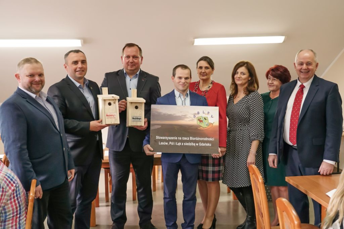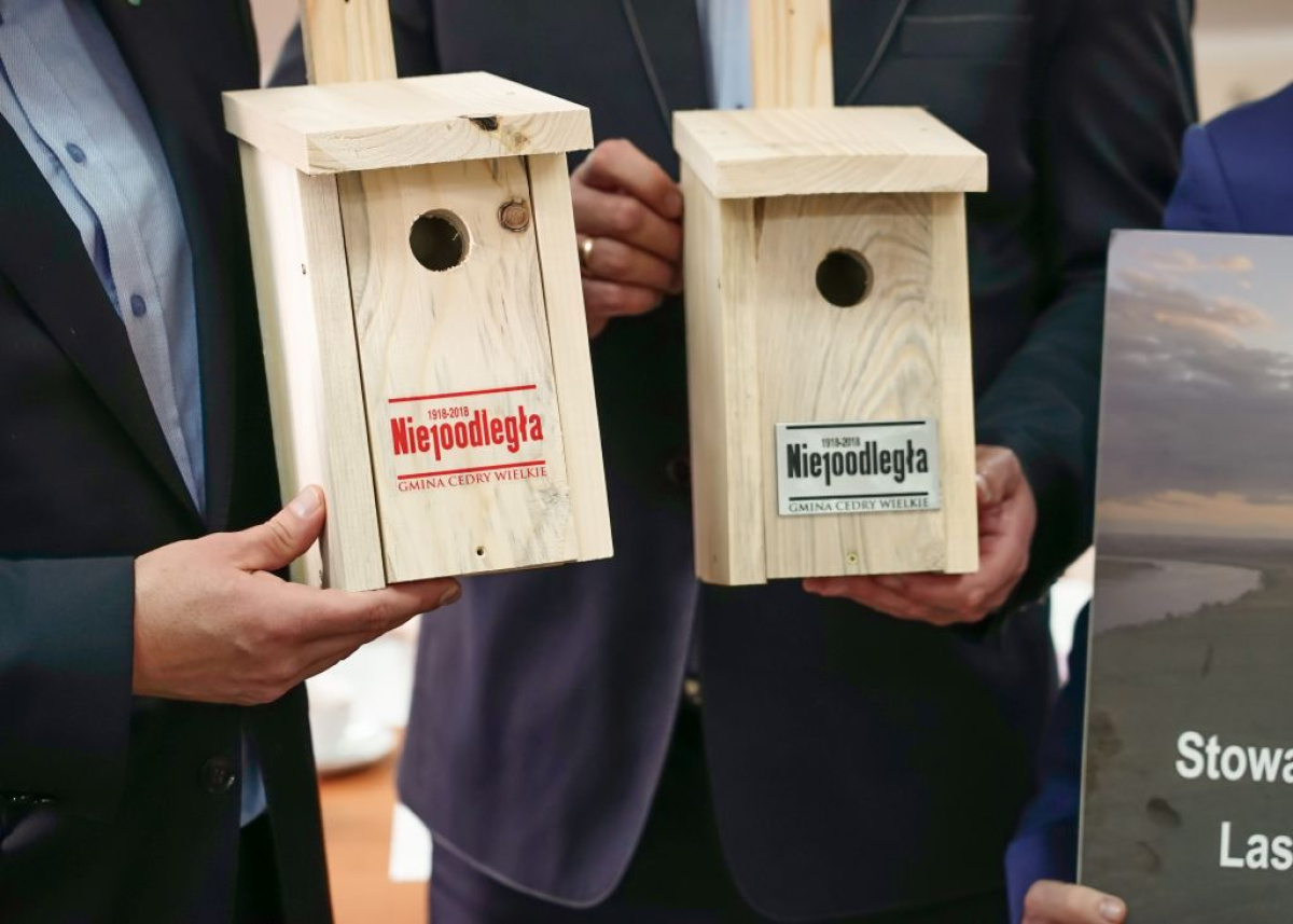 W dniu 14 listopada 2018 r. w trakcie Sesji Rady Gminy Cedry Wielkie odbyło się uroczyste przekazanie 100 budek lęgowych dla drobnego ptactwa, zakupionych przez Gminę Cedry Wielkie z okazji 100-lecia odzyskania przez Polskę niepodległości. Reprezentujący Obdarowanego, Stowarzyszenie na rzecz Bioróżnorodności Lasów, Pól i Łąk, Pan Przemysław Nawra oraz Pan Mateusz Potrykus odebrali z rąk Wójta Pana Janusza Golińskiego oraz Radnych Gminy Cedry Wielkie budki, które zawisnąć mają na drzewach wszystkich sołectw naszej gminy.