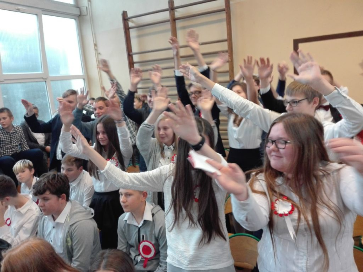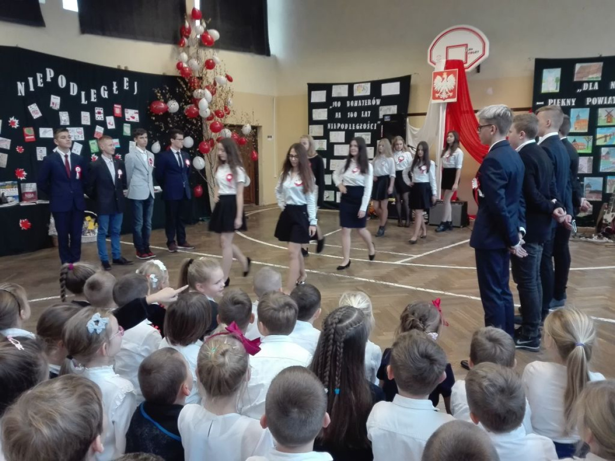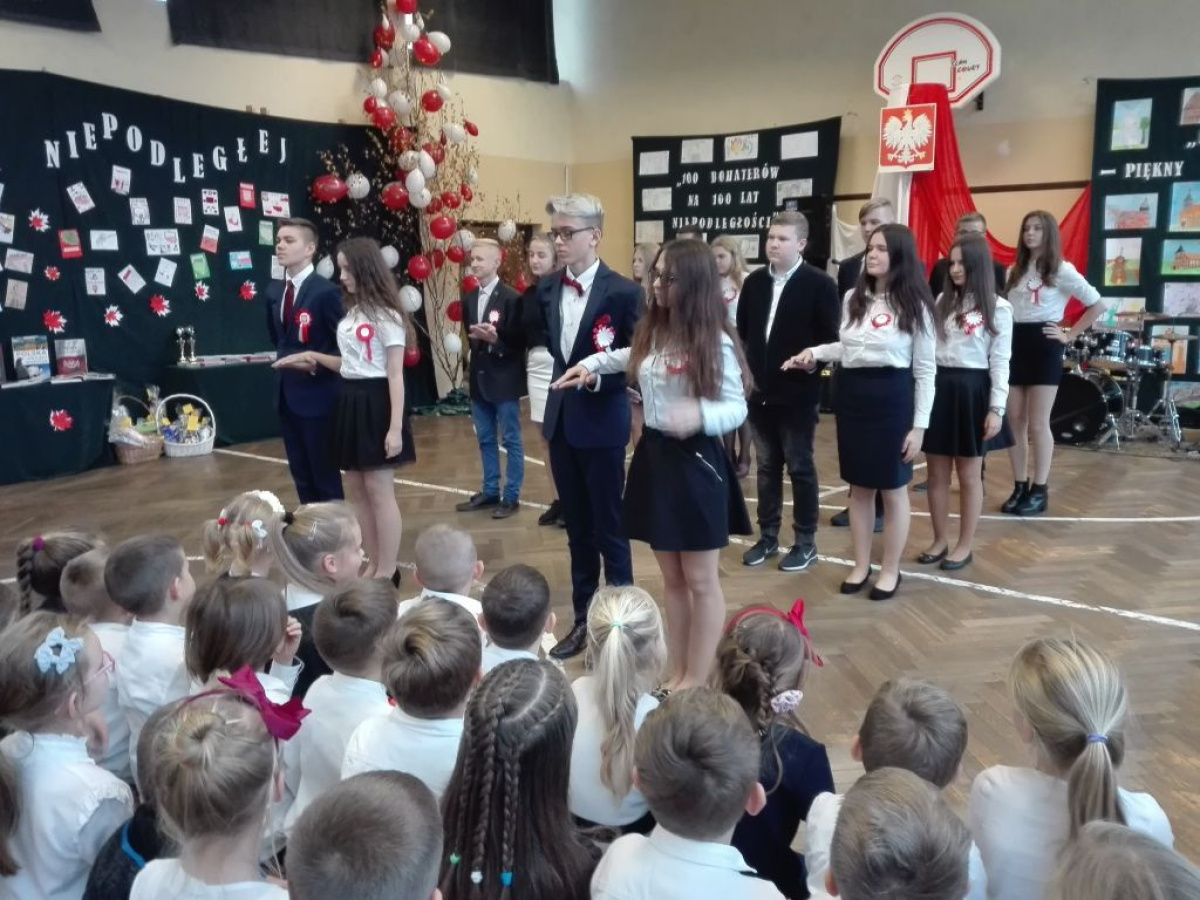 Uroczystość rozpoczęła się polonezem, którego zatańczyli uczniowie klas III gimnazjum. Następnie, o godzinie 11.11, wszyscy uczniowie, grono pedagogiczne i pracownicy szkoły przyłączyli się do akcji „Rekord dla Niepodległej”. W ramach świętowania 100. rocznicy odzyskania przez Polskę niepodległości wspólnie zaśpiewano 4 zwrotki hymnu narodowego.