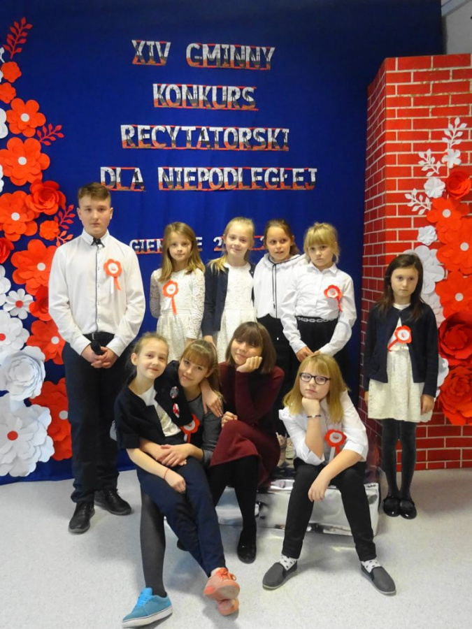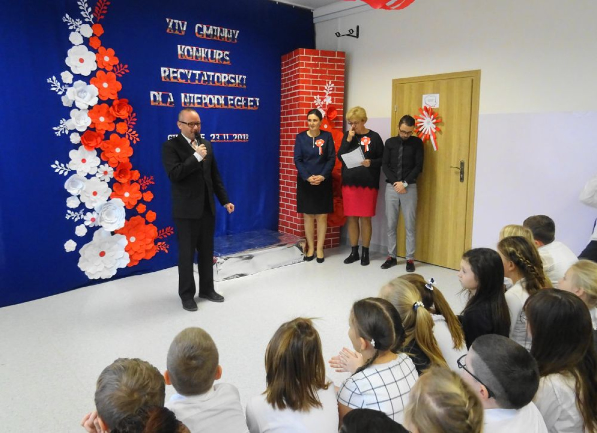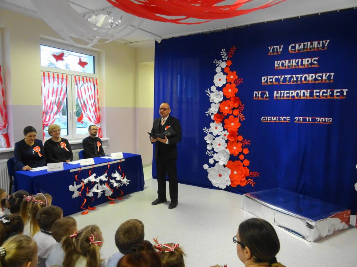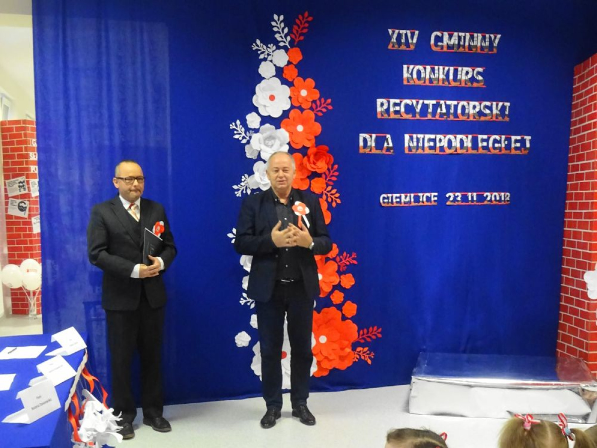 11 listopada 2018 r. w całym kraju uroczyście obchodzono setną rocznicę odzyskania niepodległości przez Polskę. Z tej okazji 23 listopada w Szkole Podstawowej im. Jana Brzechwy w Giemlicach zorganizowano gminny konkurs recytatorski, gdzie w każdym zakątku można było podziwiać dekoracje tematycznie związane z hasłem przewodnim imprezy. Uroczystego otwarcia XIV Gminnego Konkursu Recytatorskiego Dla Niepodległej… dokonali wspólnie Pan Janusz Goliński - Wójt Gminy Cedry Wielkie oraz Pan Tomasz Szlak - Dyrektor Szkoły.