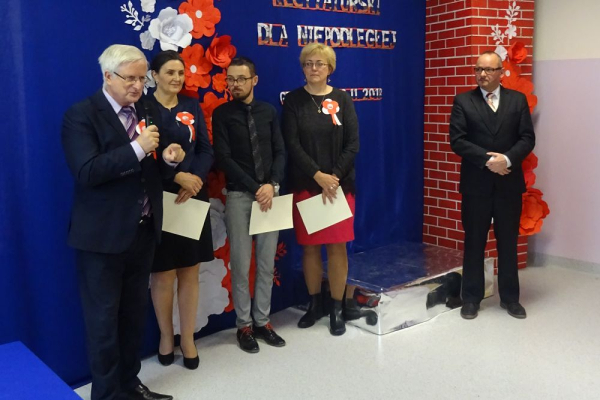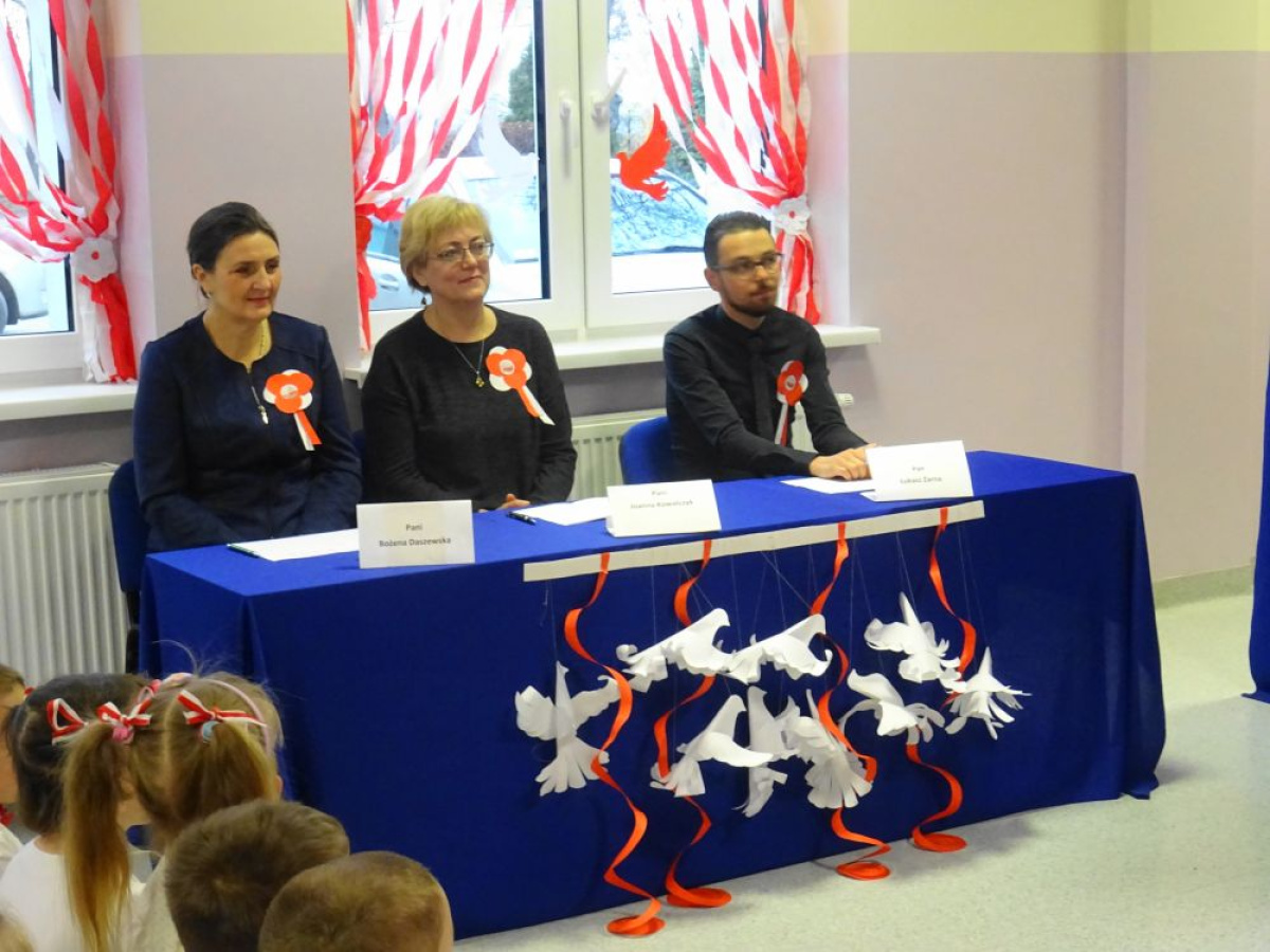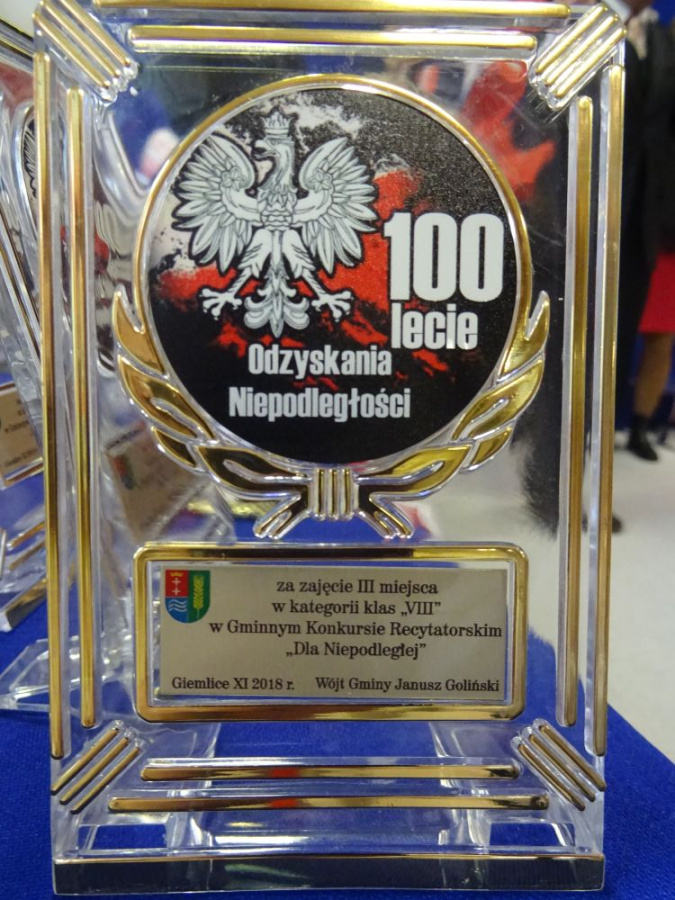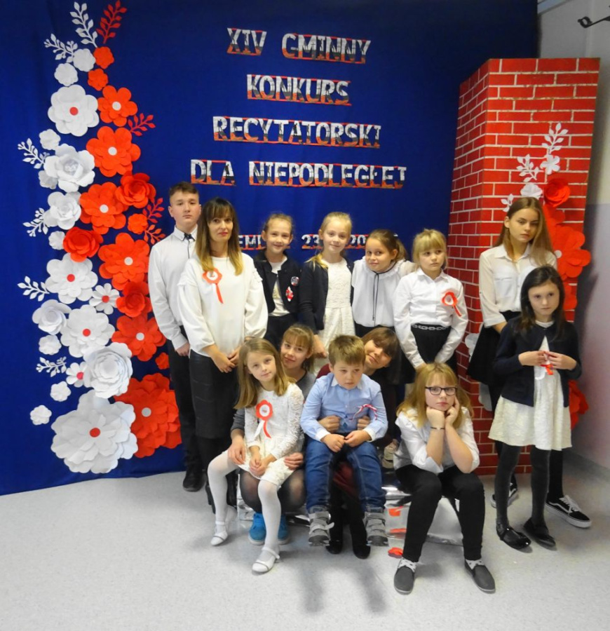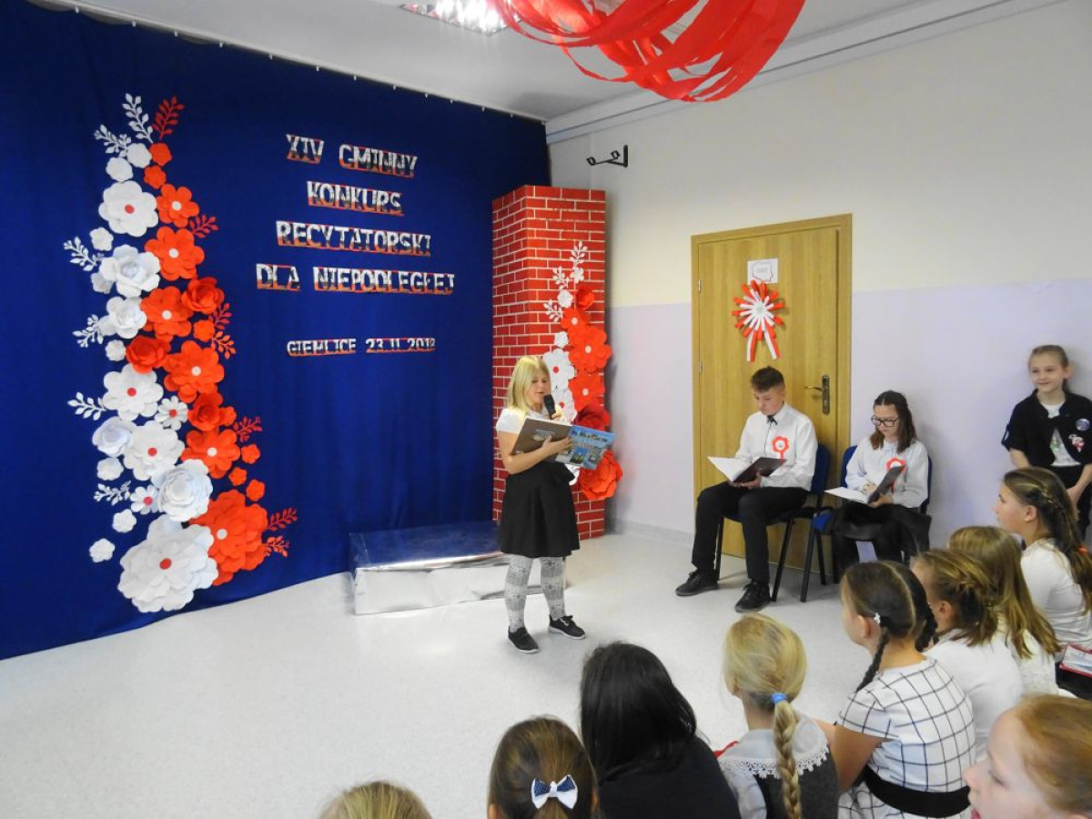11 listopada 2018 r. w całym kraju uroczyście obchodzono setną rocznicę odzyskania niepodległości przez Polskę. Z tej okazji 23 listopada w Szkole Podstawowej im. Jana Brzechwy w Giemlicach zorganizowano gminny konkurs recytatorski, gdzie w każdym zakątku można było podziwiać dekoracje tematycznie związane z hasłem przewodnim imprezy. Uroczystego otwarcia XIV Gminnego Konkursu Recytatorskiego Dla Niepodległej… dokonali wspólnie Pan Janusz Goliński - Wójt Gminy Cedry Wielkie oraz Pan Tomasz Szlak - Dyrektor Szkoły.