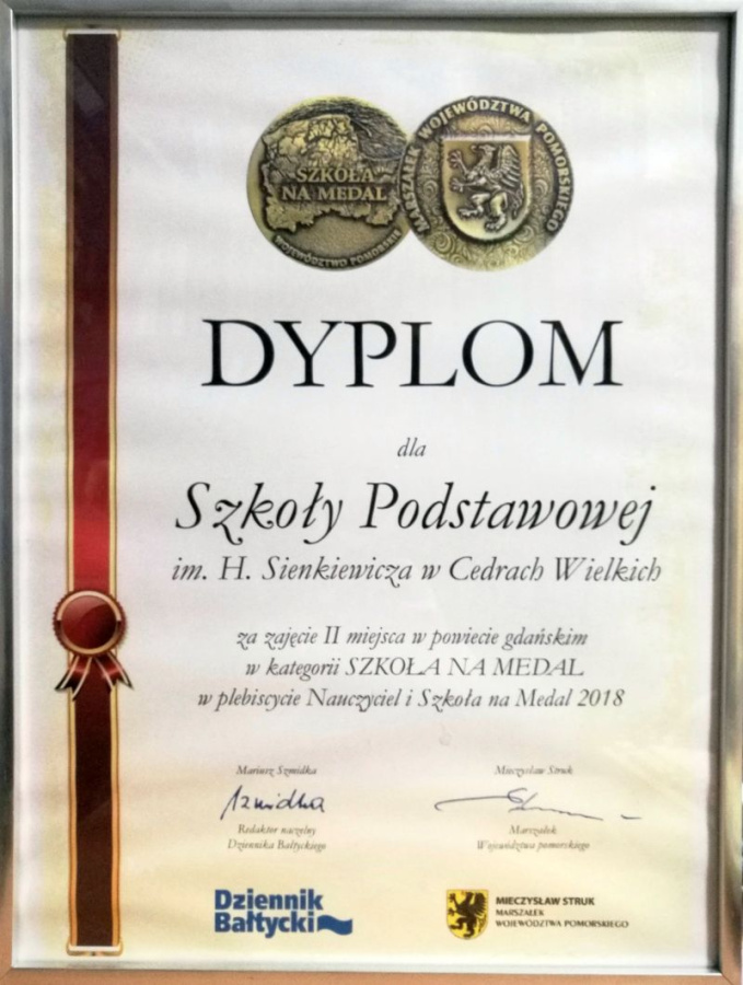 W sobotę, 15 grudnia, w Teatrze Wybrzeże odbyło się uroczyste podsumowanie plebiscytu Dziennika Bałtyckiego „Nauczyciel na Medal” i „Szkoła na Medal”. Patronat honorowy nad plebiscytem objął Mieczysław Struk - Marszałek Województwa Pomorskiego. Wśród laureatów etapu powiatowego znalazła się Szkoła Podstawowa im. Henryka Sienkiewicza w Cedrach Wielkich, która zdobyła II miejsce w powiecie (315 oddanych głosów). Natomiast Pan Sławomir Turzyński, nauczyciel tej placówki, zdobył I miejsce w powiecie w kategorii „Nauczyciel na Medal” (621 głosów). Pamiątkowy dyplom dla Szkoły oraz Medal odebrała Pani Joanna Stępień, dyrektor szkoły.