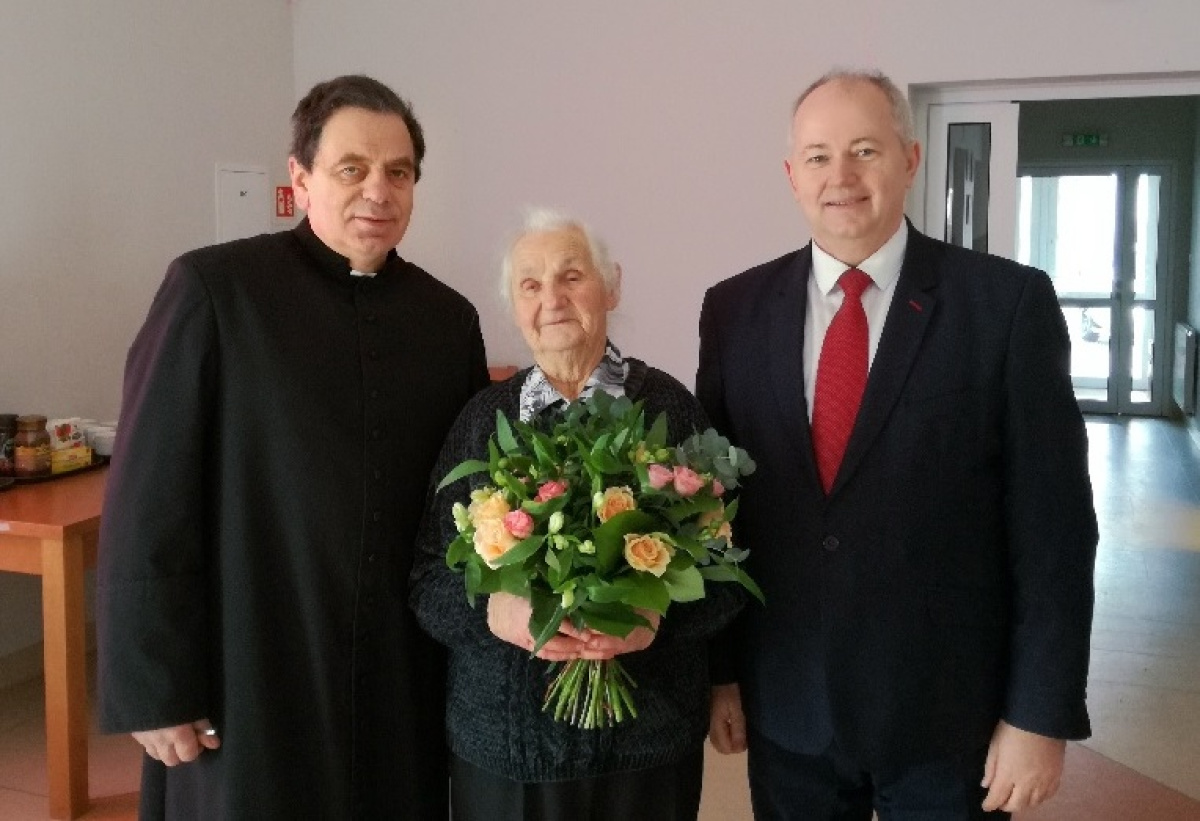 Z tej okazji Pan Janusz Goliński - Wójt Gminy Cedry Wielkie wraz z Kierownik Gminnego Ośrodka Pomocy Społecznej w Cedrach Wielkich Grażyną Berezą oraz Ks. dr. Czesławem Sołtys odwiedzili szanowną jubilatkę z drobnym upominkiem i bukietem kwiatów.