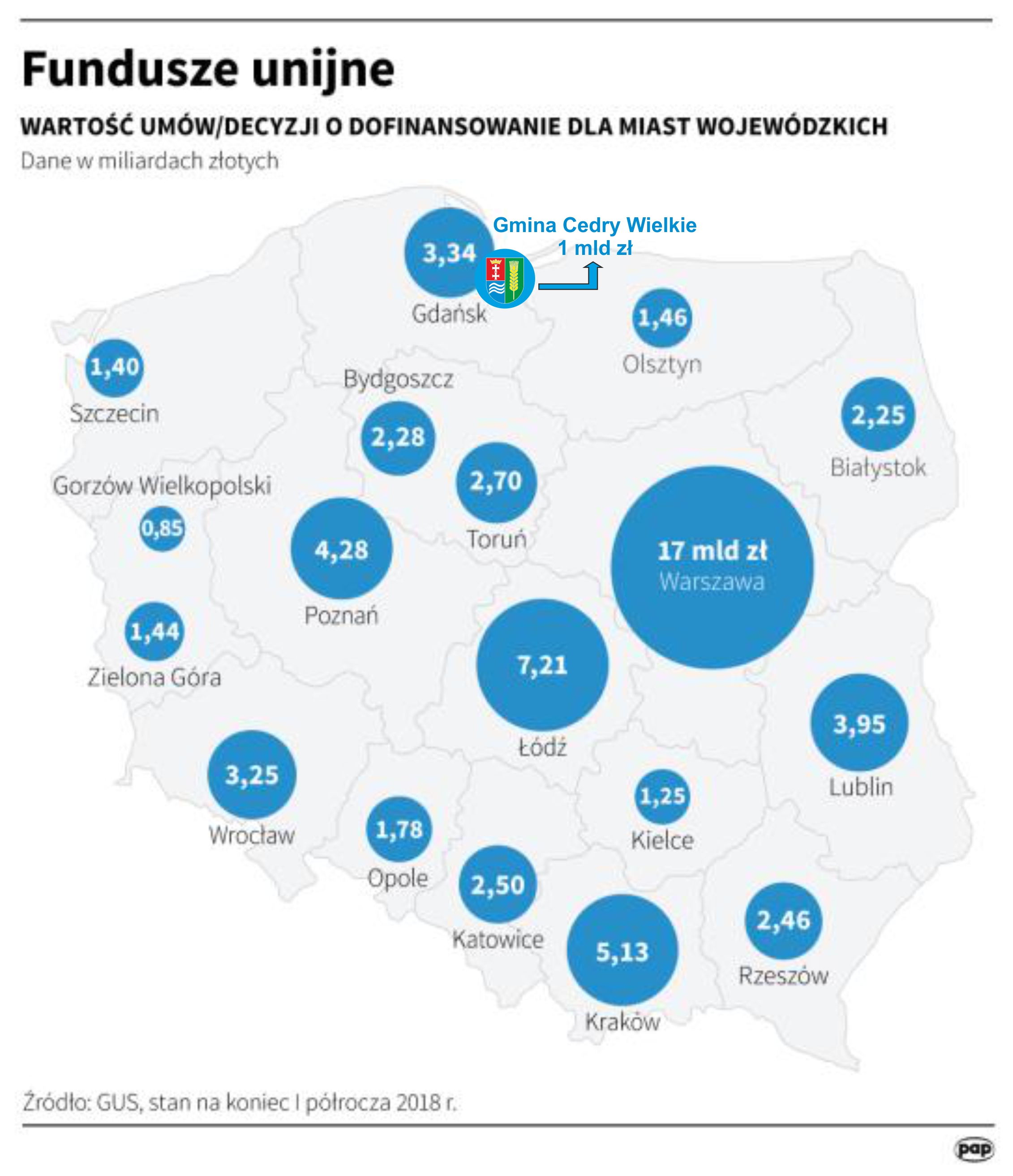 We wszystkich 2478 gminach w Polsce, w tym również w Gminie Cedry Wielkie realizowane były w ubiegłym roku projekty unijne z polityki spójności. Ich łączna wartości wg danych z Głównego Urzędu Statystycznego to niemal 186,4 mld zł. Gmina Cedry Wielkie została uplasowana na wysokim 22 miejscu, wśród wszystkich Gmin.