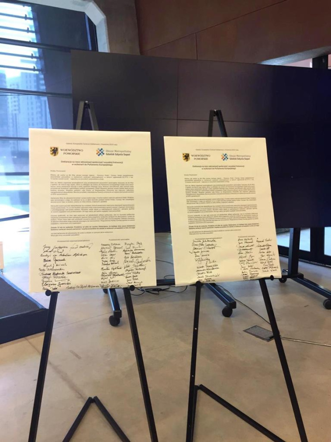 92 przedstawicieli samorządu terytorialnego oraz organizacji pozarządowych, w tym Marszałek Województwa Pomorskiego podpisało „Deklarację na rzecz aktywizacji społecznej i wysokiej frekwencji w wyborach do Parlamentu Europejskiego”. Deklaracja ta jest poparciem dla uczestnictwa w życiu wspólnej Europy.