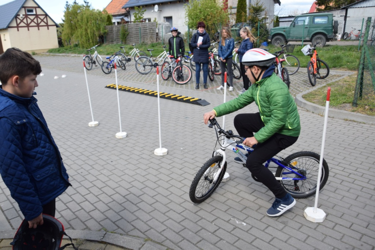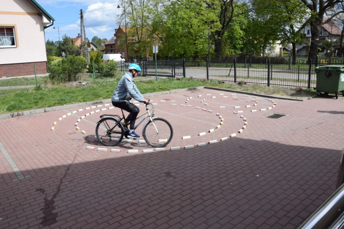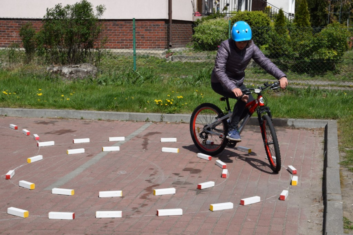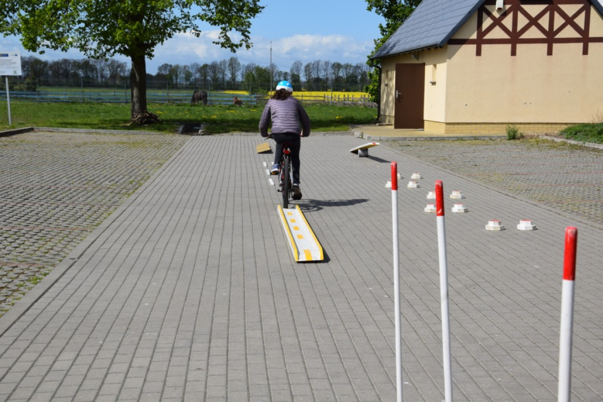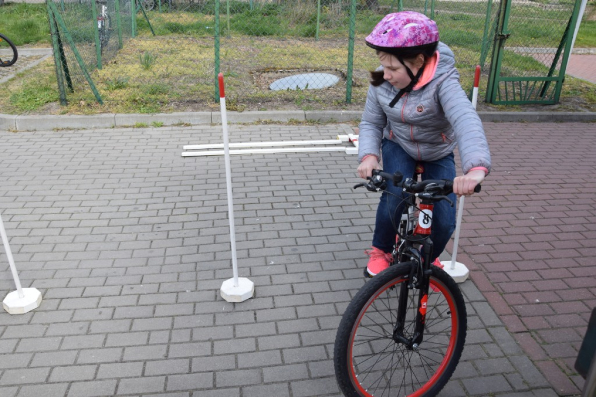 - Część praktyczna, gdzie należało pokonać rowerowy tor przeszkód, składający się z „ósemki”, slalomu z ograniczeniem, rynny, korytarza z desek, pochylni, równoważni, slalomu kółkowego „żmijka”, tarki oraz zatrzymania w miejscu.