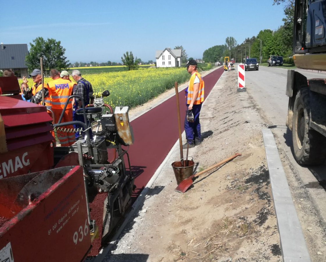 Generalny Wykonawca ścieżki rowerowej na terenie naszej gminy rozpoczął końcowy etap budowy w zakresie kładzenia masy bitumicznej w kolorze czerwonym. Prace są prowadzone na odcinku od miejscowości Cedry Małe do ul. Pionierów Żuław w Cedrach Wielkich, który był dla nas priorytetowy ze względu na mieszkańców. Trasa ta umożliwi im bezpieczną komunikację pieszą i rowerową pomiędzy w/w miejscowościami.