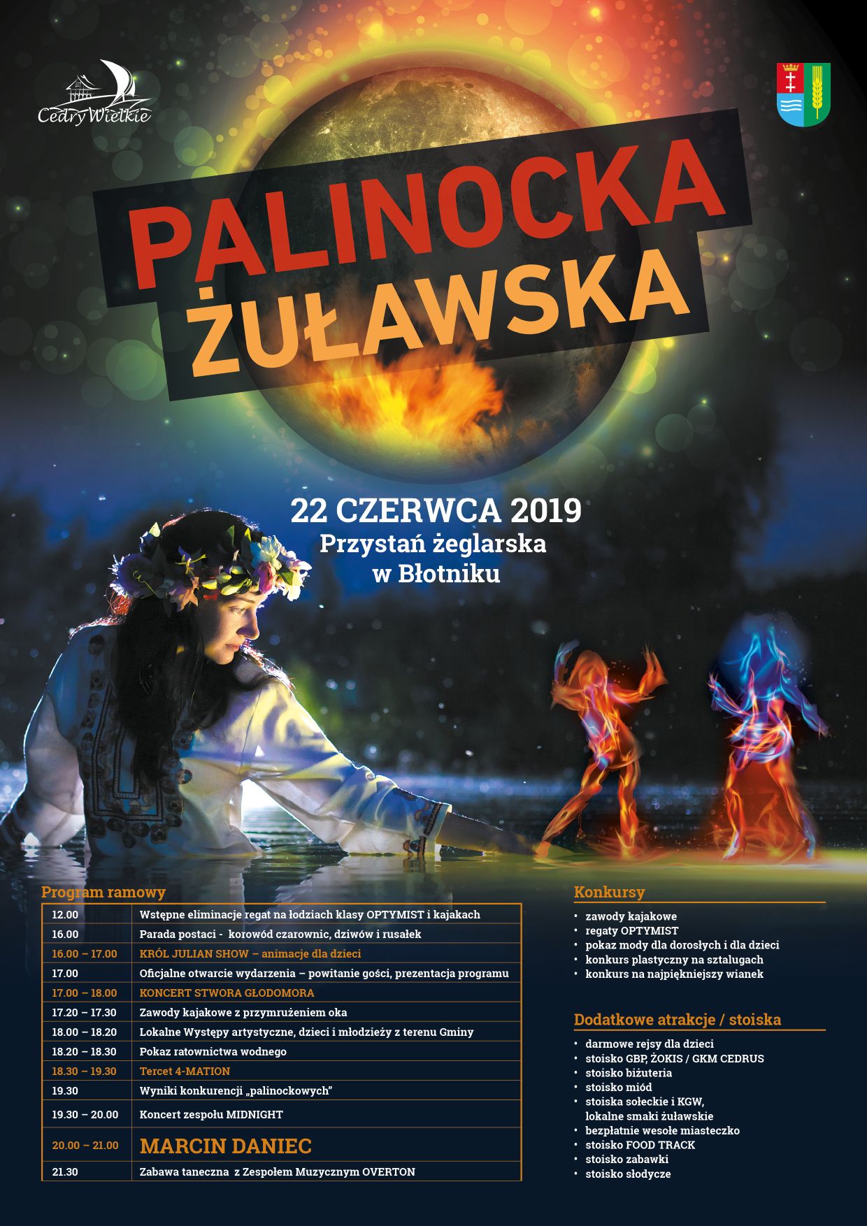 Gmina Cedry Wielkie zaprasza w dniu 22 czerwca 2019 r. na Przystań Żeglarską w Błotniku na imprezę pn: "PALINOCKA ŻUŁAWSKA". W tradycji Noc Świętojańska jest świętem wody i ognia, słońca i księżyca. Zaplanowane wydarzenie będzie miało charakter ponadregionalny i stanowić będzie wizytówkę podejmowanych przez Gminę działań w zakresie kultury i sportu.