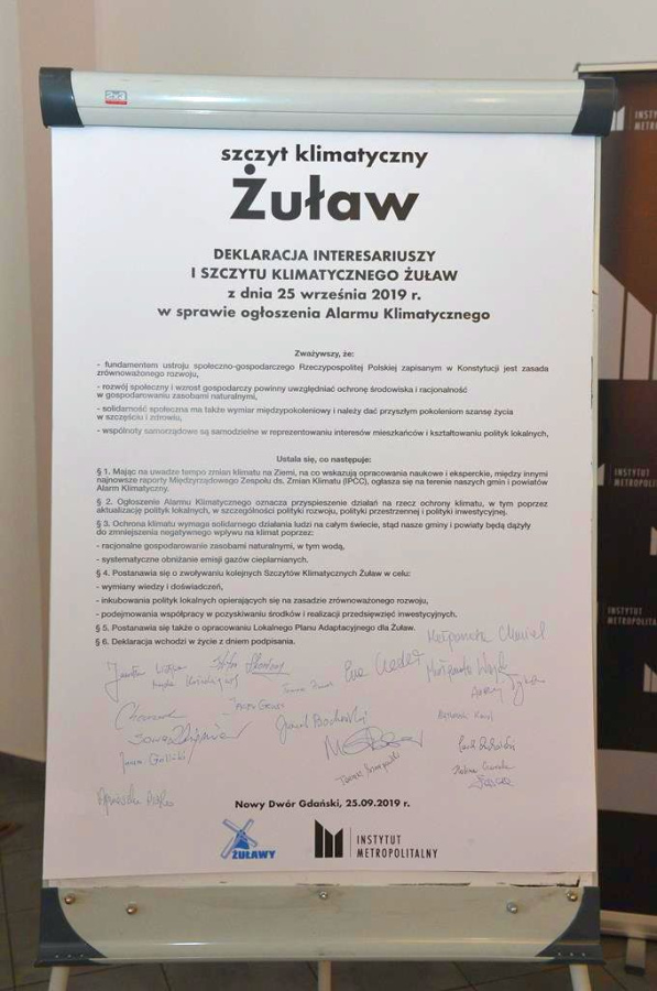 Podczas szczytu podpisano „Deklarację Interesariuszy I Szczytu Klimatycznego Żuław” w sprawie ogłoszenia alarmu klimatycznego na Żuławach. Napisano w nim, że gminy zobowiązują się do zmniejszania negatywnego wpływu na klimat poprzez racjonalne gospodarowanie zasobami naturalnymi – w tym wodą – systematyczne obniżanie emisji gazów cieplarnianych, a także opracowania Lokalnego Planu Adaptacyjnego dla Żuław czy też podejmowania współpracy w zakresie pozyskiwaniu środków i realizacji przedsięwzięć inwestycyjnych.