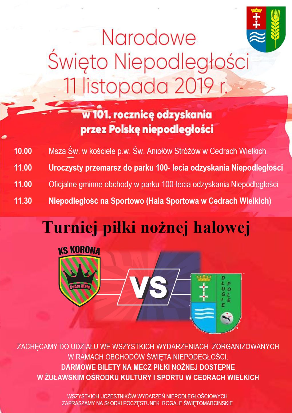 W tym roku przypada 101. rocznica odzyskania niepodległości. Uroczystości w Cedrach Wielkich rozpoczną się mszą św. w kościele p.w. Św. Aniołów Stróżów (godz. 10.00). Po niej – około godz. 11.00 – przemaszerujemy na główne miejsce uroczystości, a więc do Parku 100-lecia Odzyskania Niepodległości. Z kolei w naszej hali o godz. 11.30 rozpocznie się sportowe świętowanie.