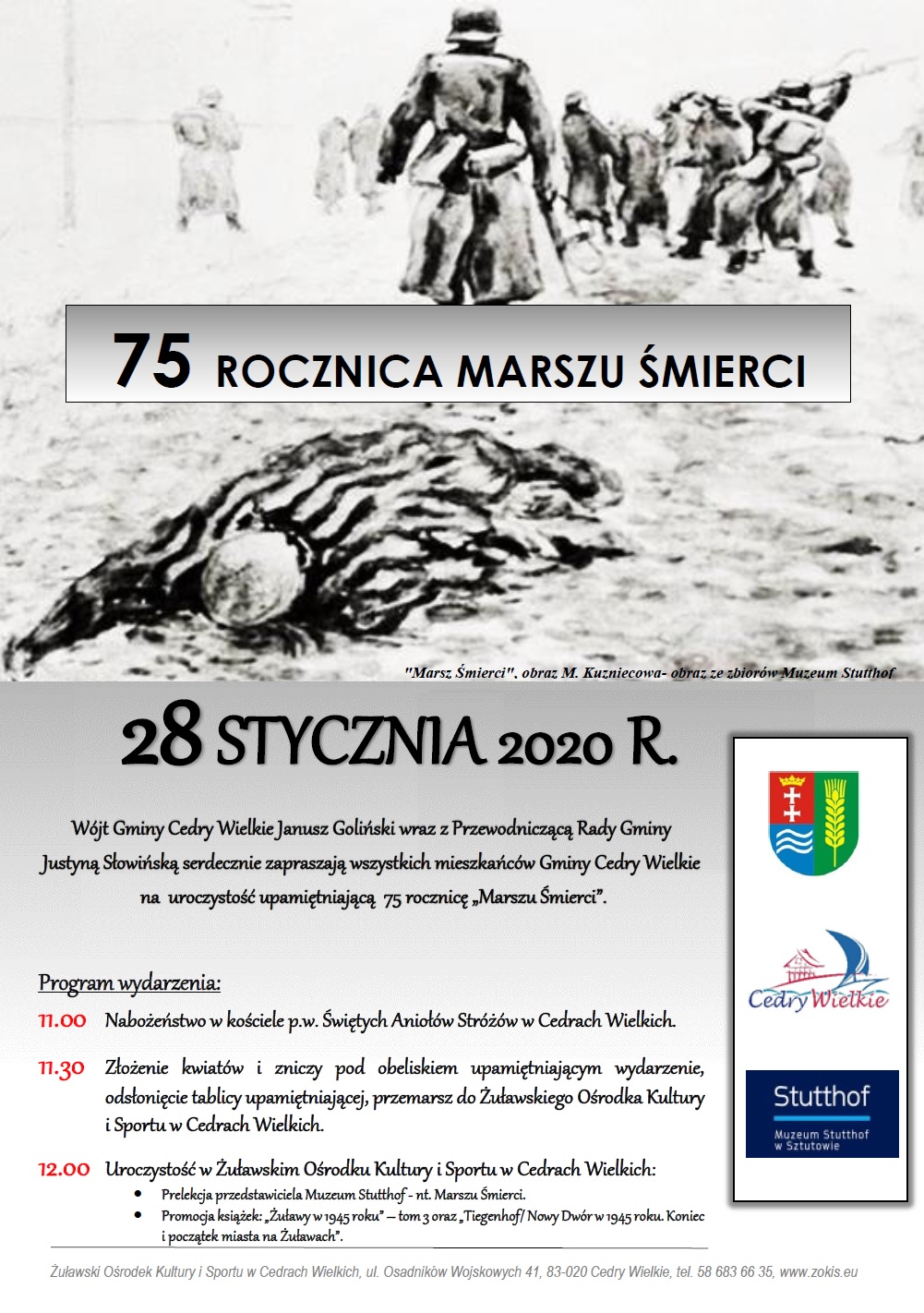 W ostatnich dniach stycznia 1945 roku mieszkańcy wielu wsi na Żuławach i Kaszubach ujrzeli przerażający widok. Zasypanymi śniegiem drogami szły kolumny ludzi w obstawie brutalnych strażników obozu koncentracyjnego w Stutthofie. 28 stycznia w Cedrach Wielkich upamiętnimy Marsz Śmierci.