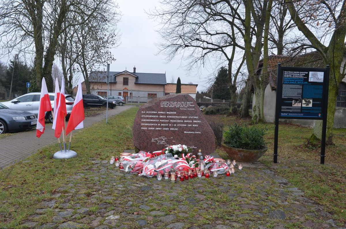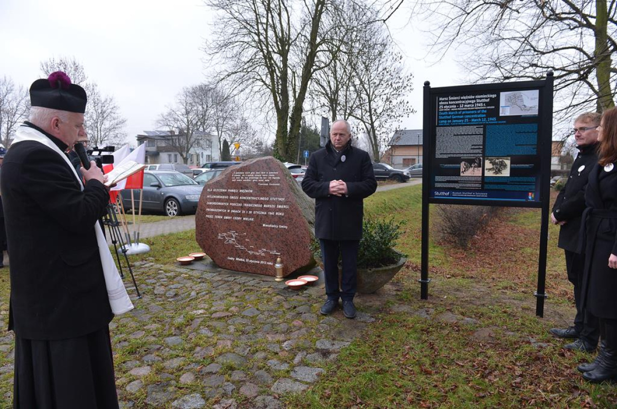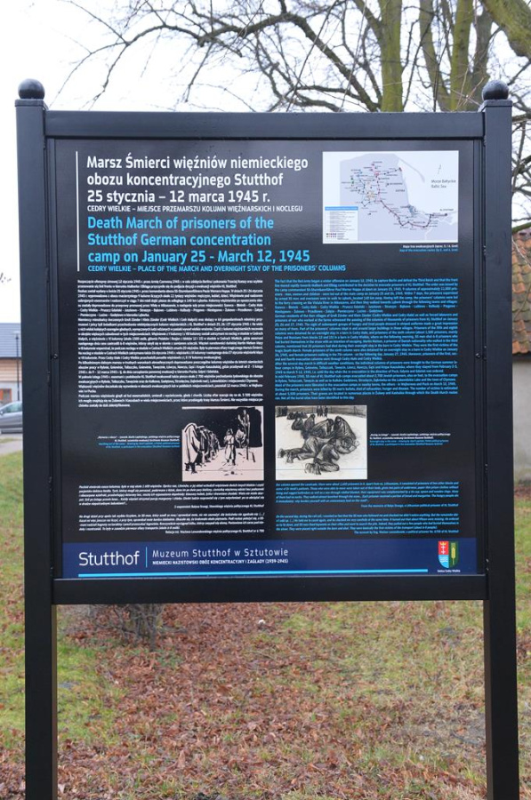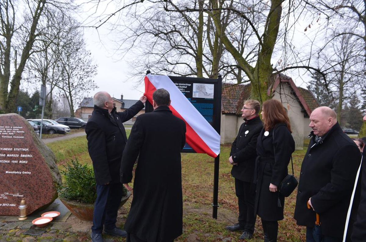 Dzięki dobrej współpracy naszej gminy z Muzeum Stutthof udało się odsłonić tablicę informacyjną, na której znaleźć można rzetelne informacje na temat Marszu Śmierci, podczas którego zginęło ok. 17 tysięcy osób.