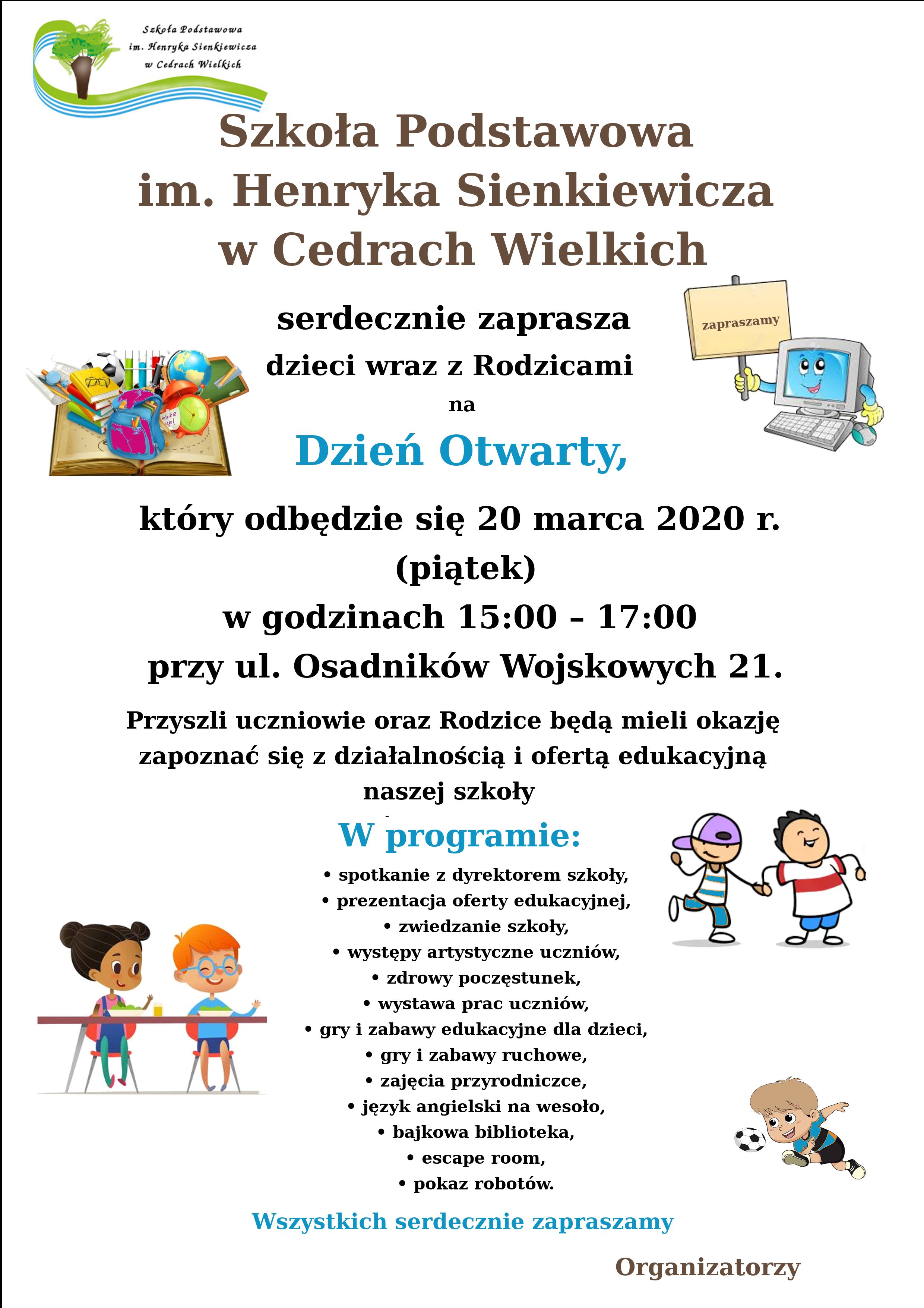 Szkoła Podstawowa w Cedrach Wielkich w swoje gościnne progi zaprasza z kolei 20 marca (piątek, godz. 15.00 - 17.00). Będzie to okazja do zwiedzenia szkoły i zapoznania się z ofertą edukacyjną. Uczniowie zaprezentują również swoje zdolności artystyczne. Przeprowadzone będą różnego rodzaju gry i zabawy. Spalone kalorie będzie można zaś uzupełnić podczas zdrowego poczęstunku.