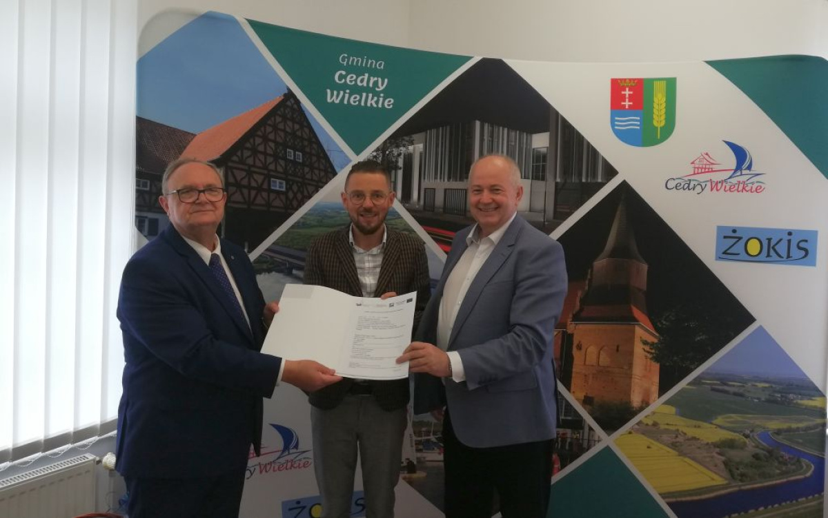 Dnia 10 lipca 2020 r. w obecności Pana Józefa Sarnowskiego – członka Zarządu Województwa Pomorskiego i Pana Janusza Golińskiego Wójta Gminy Cedry Wielkie uroczyście została przekazana umowa o dofinansowanie projektu pn. „Zachowanie i upowszechnianie rybackiego dziedzictwa kulturowego poprzez uporządkowanie ogólnodostępnej infrastruktury turystycznej – stawu wraz z pomostem, związanej z działalnością rybacką” dla Żuławskiego Ośrodka Kultury i Sportu w Cedrach Wielkich.