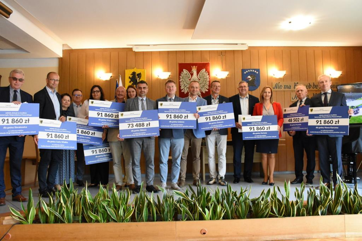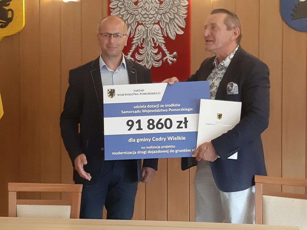 Piotr Jaśniewski, zastępca wójta gminy Cedry Wielkie, odebrał symboliczny czek na niemal 100 tysięcy złotych. Pieniądze będą wydane na budowę drogi transportu rolnego w Długim Polu. Uroczystość, podczas której wicemarszałek województwa pomorskiego Leszek Bonna wręczał symboliczne czeki, odbyła się w Kartuzach.