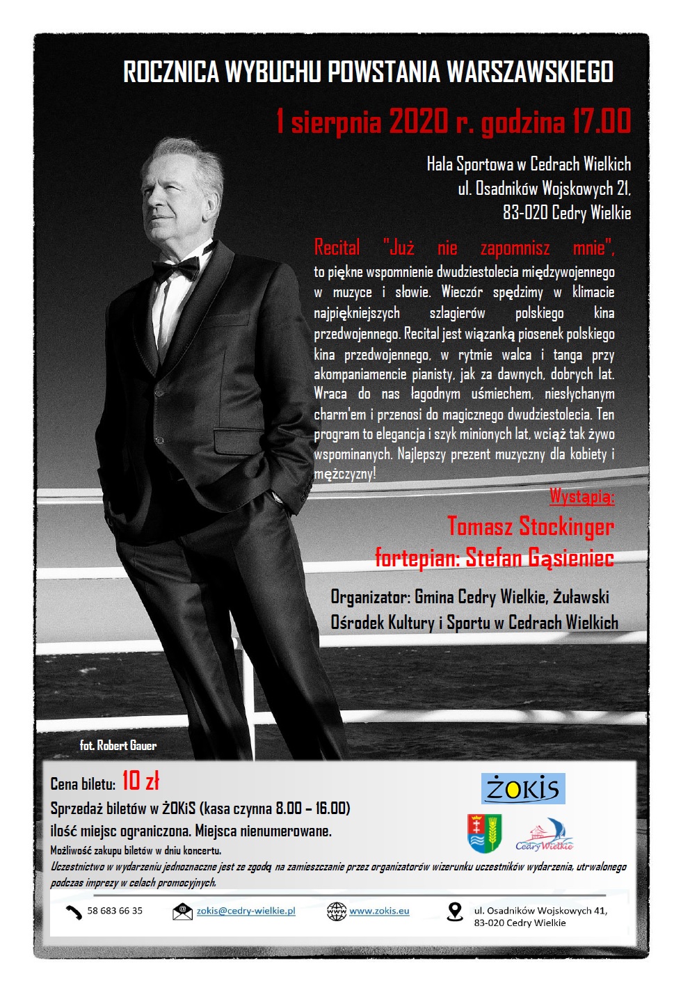 Zapraszamy na Recital pt. „Już nie zapomnisz mnie”, który odbędzie się 1 sierpnia 2020 r. (sobota) o godz. 17.00 w Hali Sportowej w Cedrach Wielkich. Będzie to piękne wspomnienie dwudziestolecia międzywojennego w muzyce i słowie. Wieczór spędzimy w klimacie najpiękniejszych szlagierów polskiego kina przedwojennego.