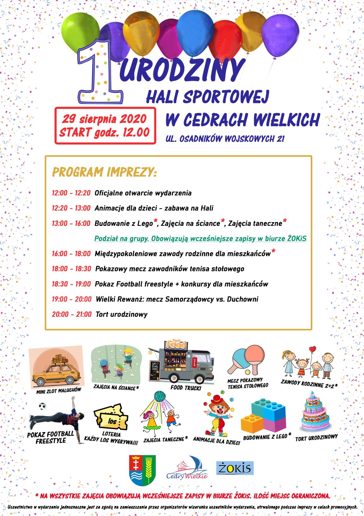 Zapraszamy wszystkich mieszkańców na UROCZYSTE PIERWSZE URODZINY HALI SPORTOWEJ W CEDRACH WIELKICH, które odbędą się 29 sierpnia (sobota) 2020 r. o godz. 12.00.