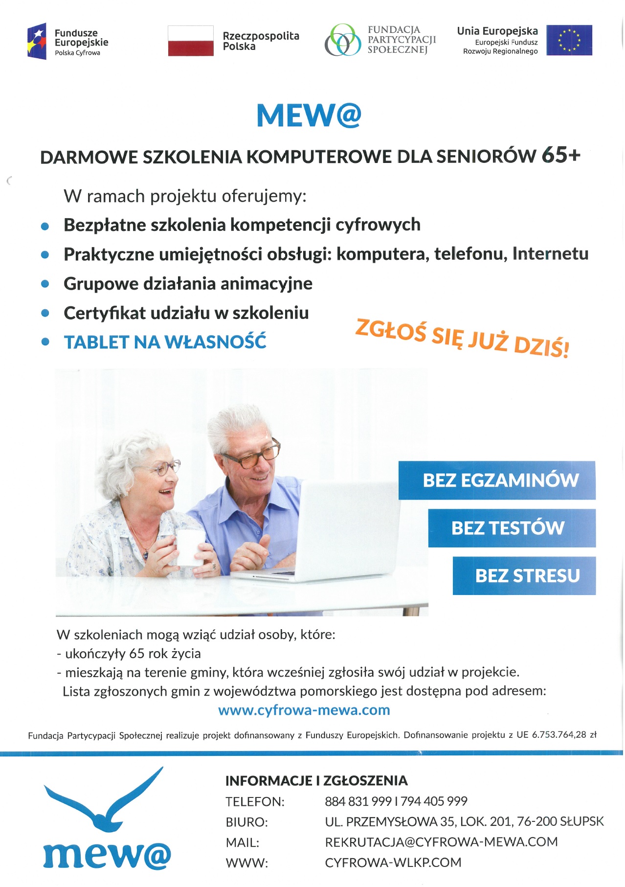 Już na jesieni mieszkańcy naszej gminy będą mogli skorzystać z bezpłatnych zajęć komputerowych, które będą organizowane w ramach projektu „Mew@”. Szkolenia dedykowane są osobom starszym, a więc tym, które ukończyły 65 lat i mieszkają na terenie gminy Cedry Wielkie.