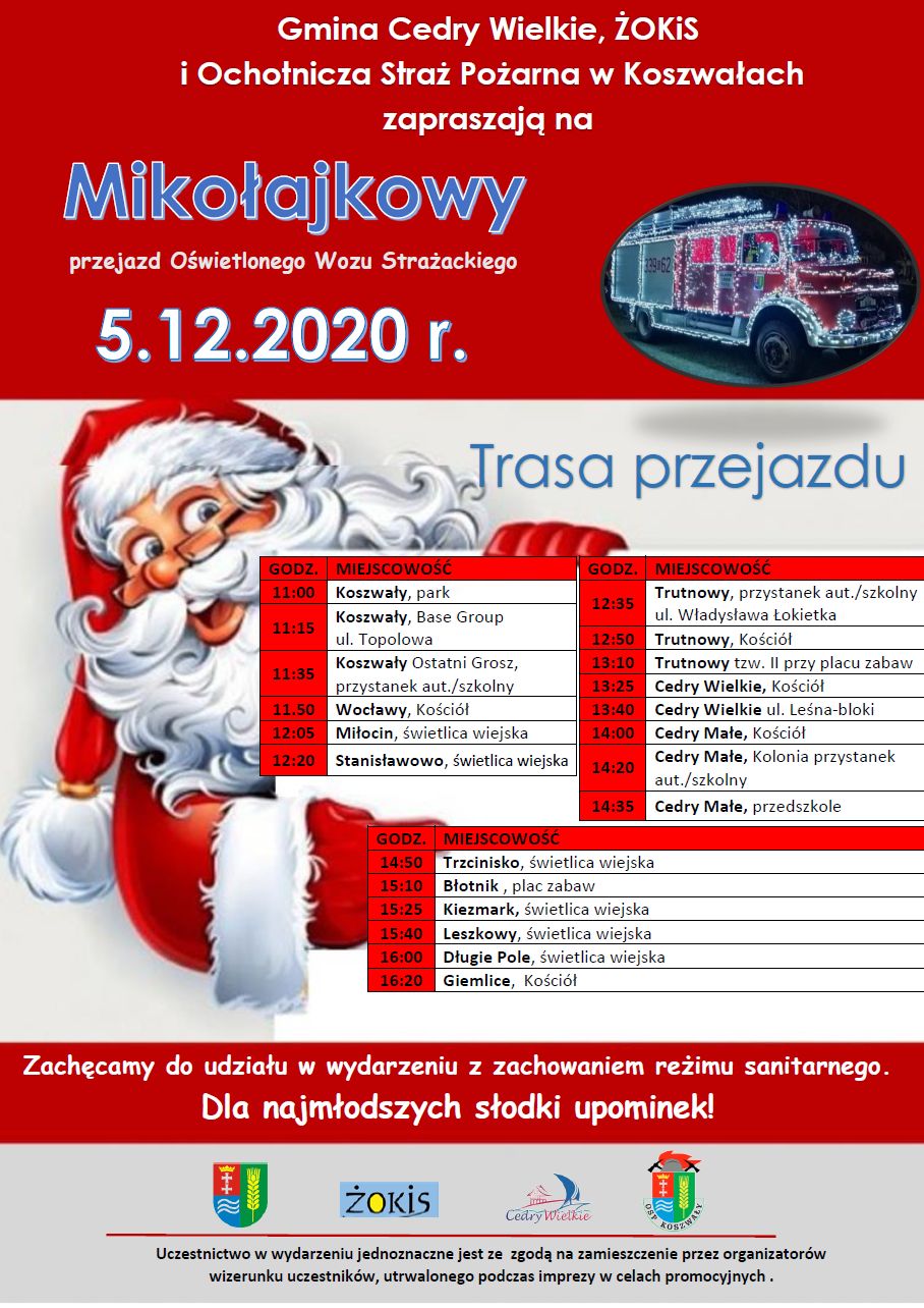 Gmina Cedry Wielkie, Żuławski Ośrodek Kultury i Sportu, oraz Ochotnicza Straż Pożarna w Koszwałach zapraszają na Mikołajkowy przejazd Wozu Strażackiego po terenie Gminy. O wyznaczonych godzinach oświetlony Wóz Strażacki wraz z Mikołajem odwiedzi sołectwa.