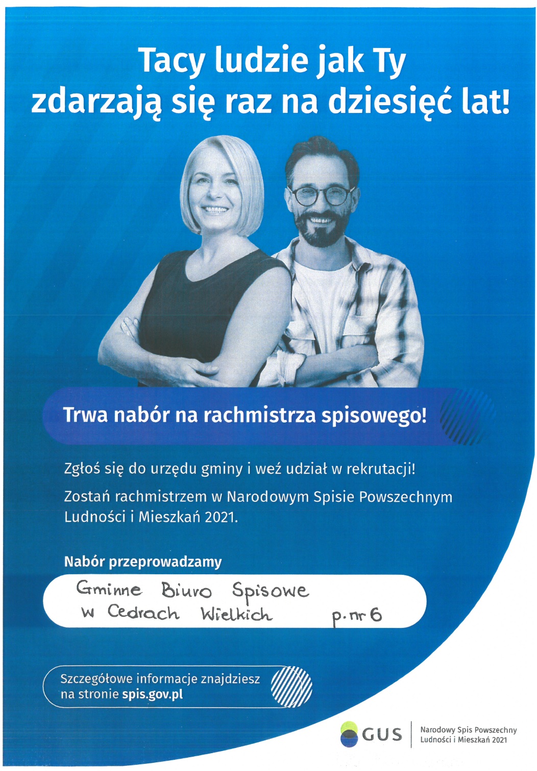 W związku z planowanym w okresie od dnia 1 kwietnia 2021 r. do dnia 30 czerwca 2021 r. Narodowym Spisie Powszechnym Ludności i Mieszkań 2021 osoby chętne na rachmistrzów spisowych na terenie gminy Cedry Wielkie prosimy o kontakt z Gminnym Biurem Spisowym pod numerem telefonu 58 692-20-43.