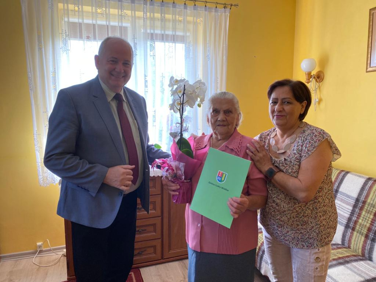 Seniorkę z Błotnika odwiedził także wójt Janusz Goliński, którzy złożył jubilatce najserdeczniejsze życzenia dalszych długich lat życia w dobrym zdrowiu i towarzystwie kochającej rodziny.
