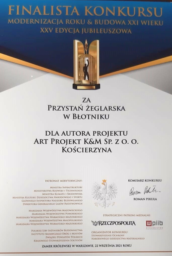 To nie jedyne wyróżnienie jakie wczoraj przypadło w udziale marinie w Błotniku. Nagrodę przyznano także Firmie ART Projekt z Kościerzyny za innowacyjny projekt m.in. za umiejscowienie budynku bosmanatu na wodzie oraz wykonawcy Navimor-Invest z Gdańska.