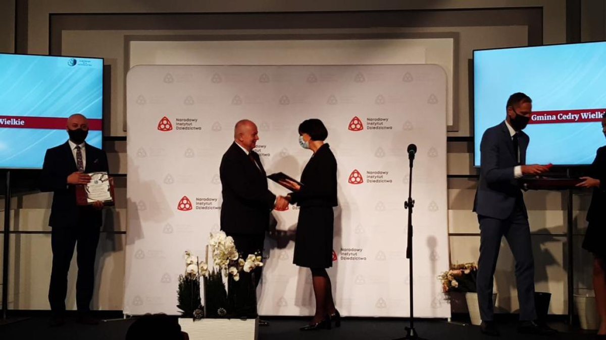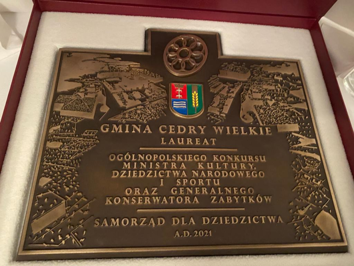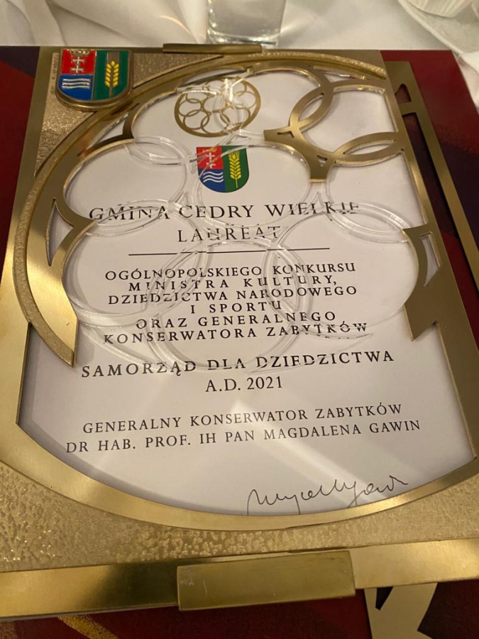 Gmina Cedry Wielkie została laureatem w ogólnopolskim konkursie „Samorząd dla Dziedzictwa”, który skierowany był do samorządów gminnych, mogących wykazać się modelowym opracowaniem, wdrażaniem i realizacją gminnego programu opieki nad zabytkami. Wczoraj w Warszawie odbyła się gala, podczas której nagrodę odebrał wójt Janusz Goliński. Nasza gmina została doceniona w kategorii gmin miejsko-wiejskich i wiejskich. Organizatorem konkursu byli: Ministerstwo Kultury, Dziedzictwa Narodowego i Sportu oraz Generalny Konserwator Zabytków, przy udziale Narodowego Instytutu Dziedzictwa.