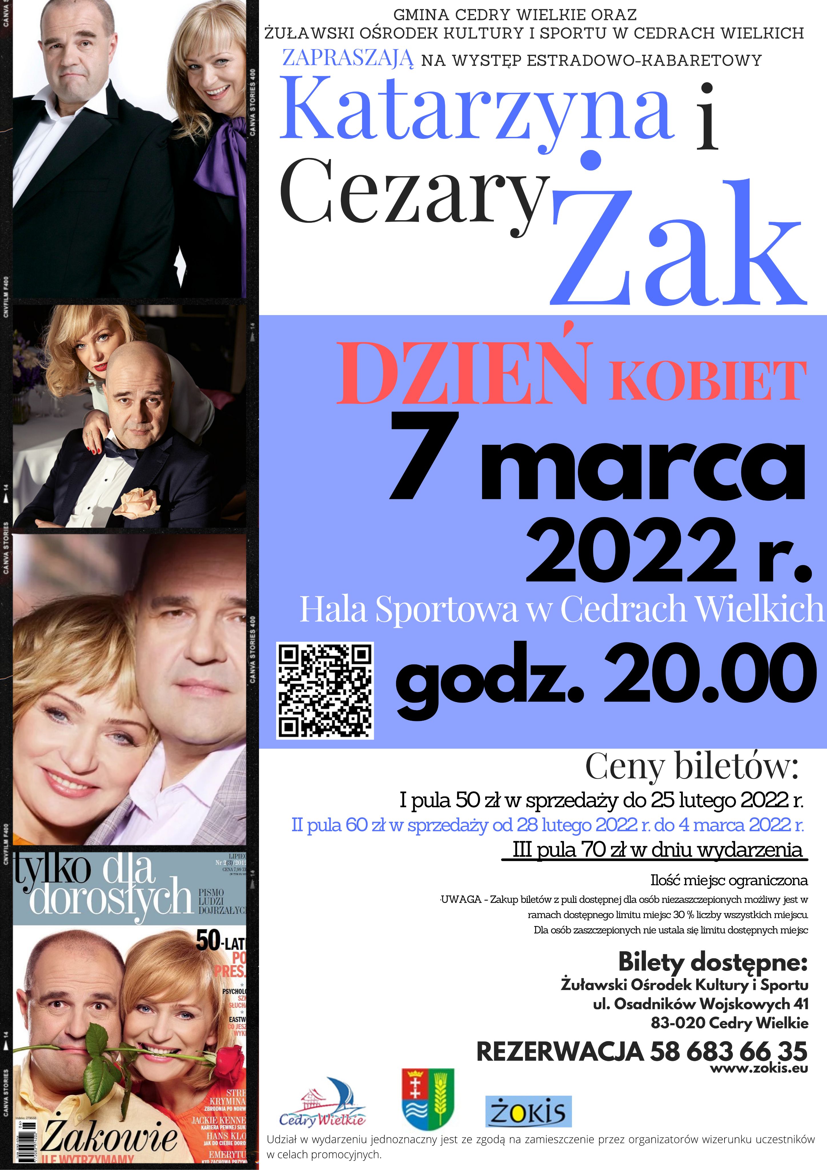 Gmina Cedry Wielkie oraz Żuławski Ośrodek Kultury i Sportu zapraszają na występ estradowo-kabaretowy Katarzyny i Cezarego Żak, który odbędzie się 7 marca 2022 roku o godz. 20:00 w Hali Sportowej w Cedrach Wielkich!