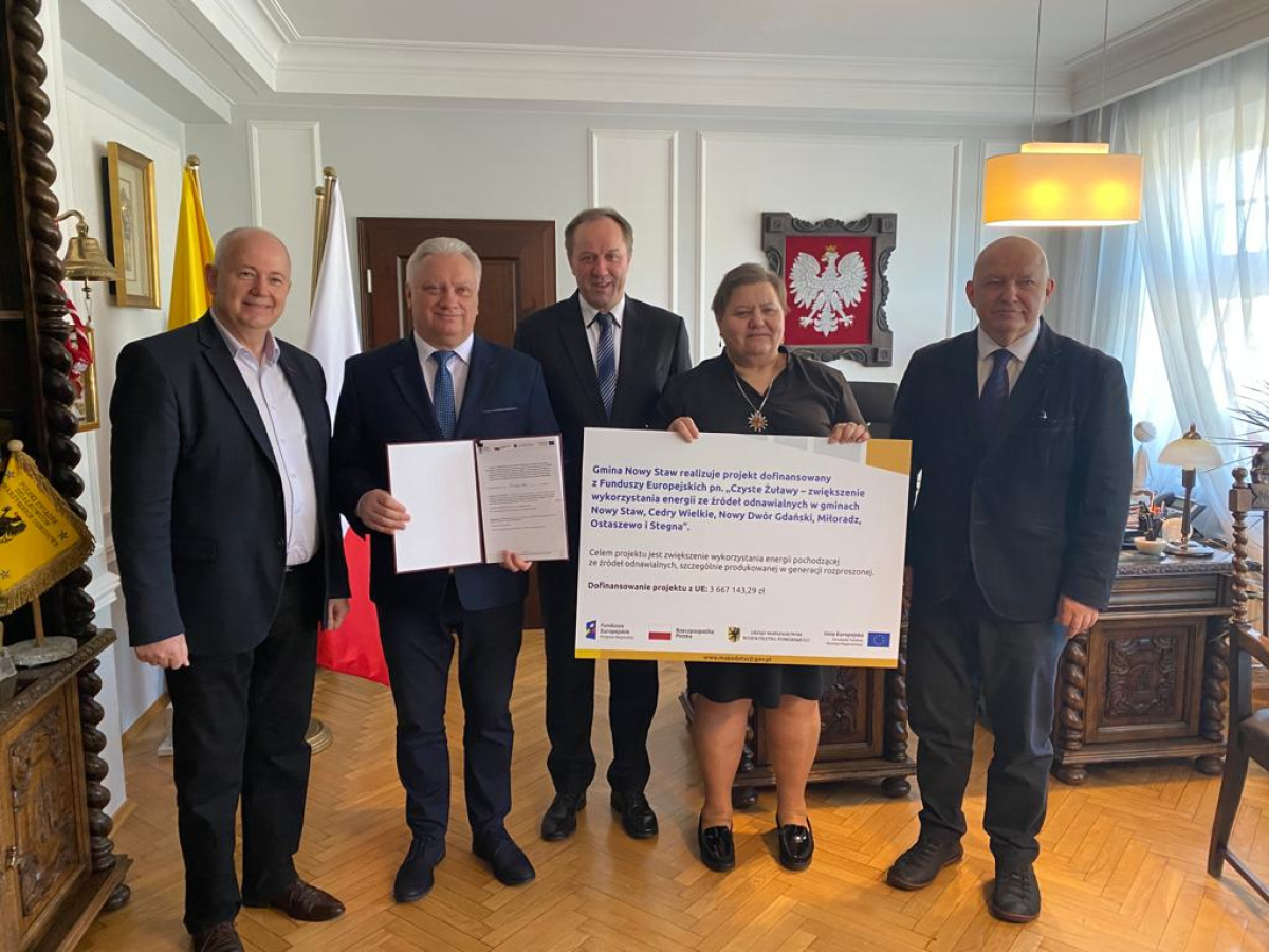 Burmistrz Nowego Stawu Jerzy Szałach i Mieczysław Struk, marszałek województwa pomorskiego podpisali umowę na realizację projektu, w ramach którego realizowane będą inwestycje na terenie sześciu gmin żuławskich – w tym również Cedry Wielkie. Nasza gmina z ogólnej puli dofinansowania otrzyma ok. 2 mln zł, a pieniądze mają być wydatkowane na kupno i montaż instalacji fotowoltaicznych na budynkach użyteczności publicznej.