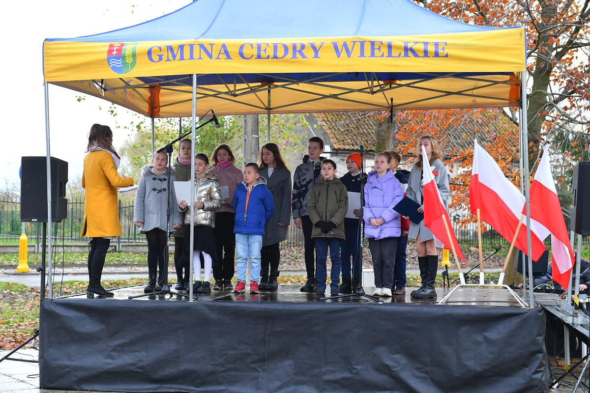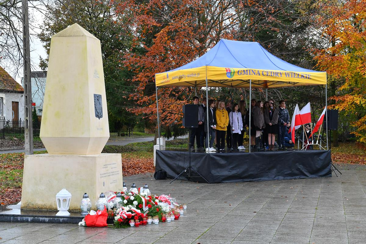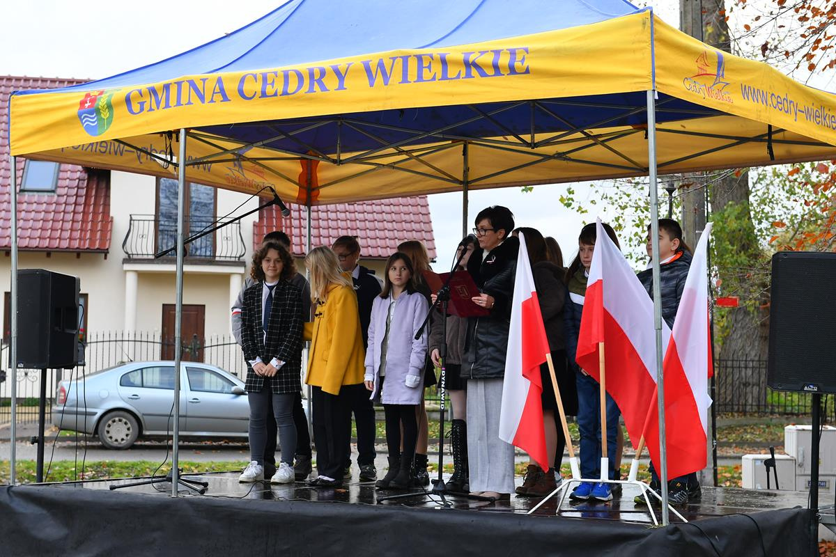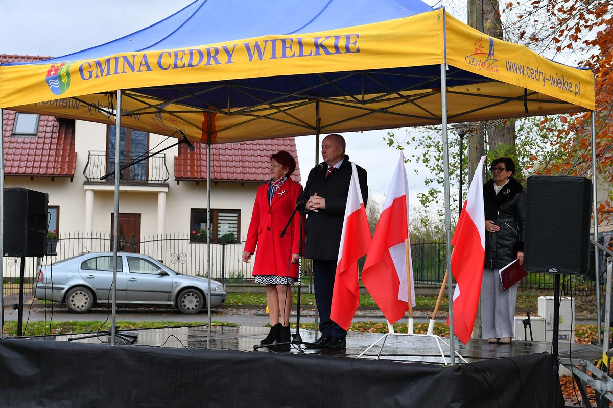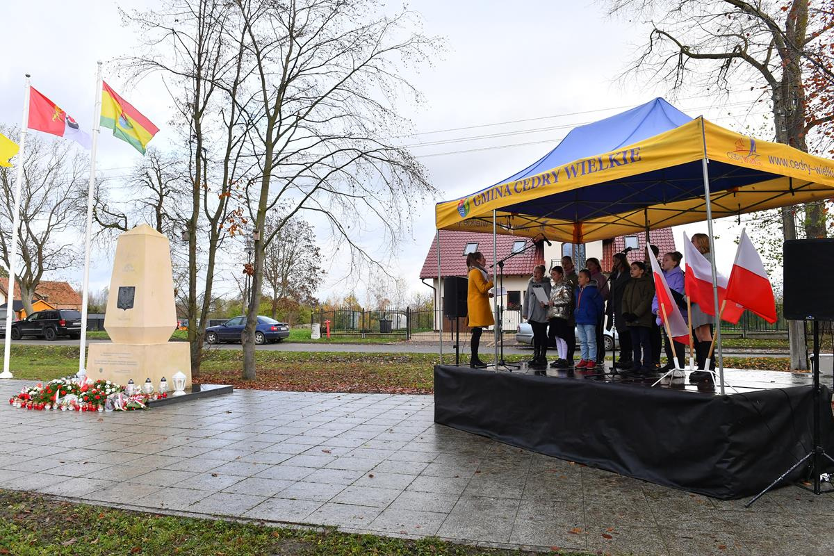 Obchody Święta Niepodległości w naszej gminie rozpoczęły się od mszy św. w kościele w Cedrach Wielkich. Po niej władze gminy oraz delegacje złożyły kwiaty pod pomnikiem 100-lecia Odzyskania Niepodległości. Nie zabrakło też okolicznościowych występów dzieci z naszych szkół. Z kolei w gminnej bibliotece chętni mogli obejrzeć wystawę Muzeum Narodowego Stutthof „Stutthof idzie” – ewakuacja więźniów obozu koncentracyjnego 25 styczeń – 12 marca 1945 r.