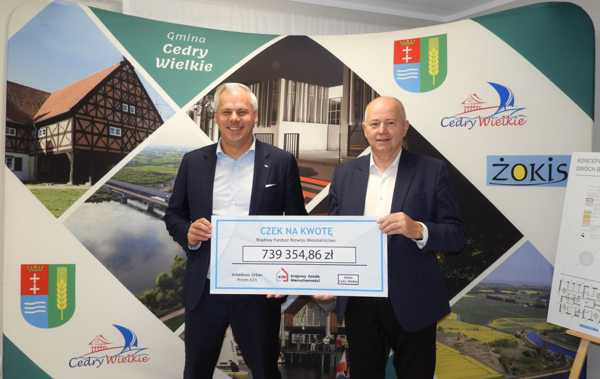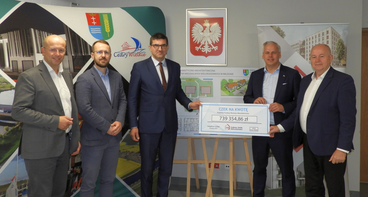 Na realizację inwestycji nasza gmina otrzymała jakiś czas temu 3 mln zł, które posłużyły na wkład do spółki SIM z siedzibą w Malborku. Wczoraj do Cedrów Wielkich przyjechali m.in. Karol Rabenda, podsekretarz stanu w Ministerstwie Aktywów Państwowych oraz Arkadiusz Urban, prezes Krajowego Zasobu Nieruchomości, którzy przekazali wójtowi Golińskiemu symboliczny czek na blisko 740 tys. zł. Pieniądze będą oczywiście wydatkowane na budowę mieszkań w Miłocinie.