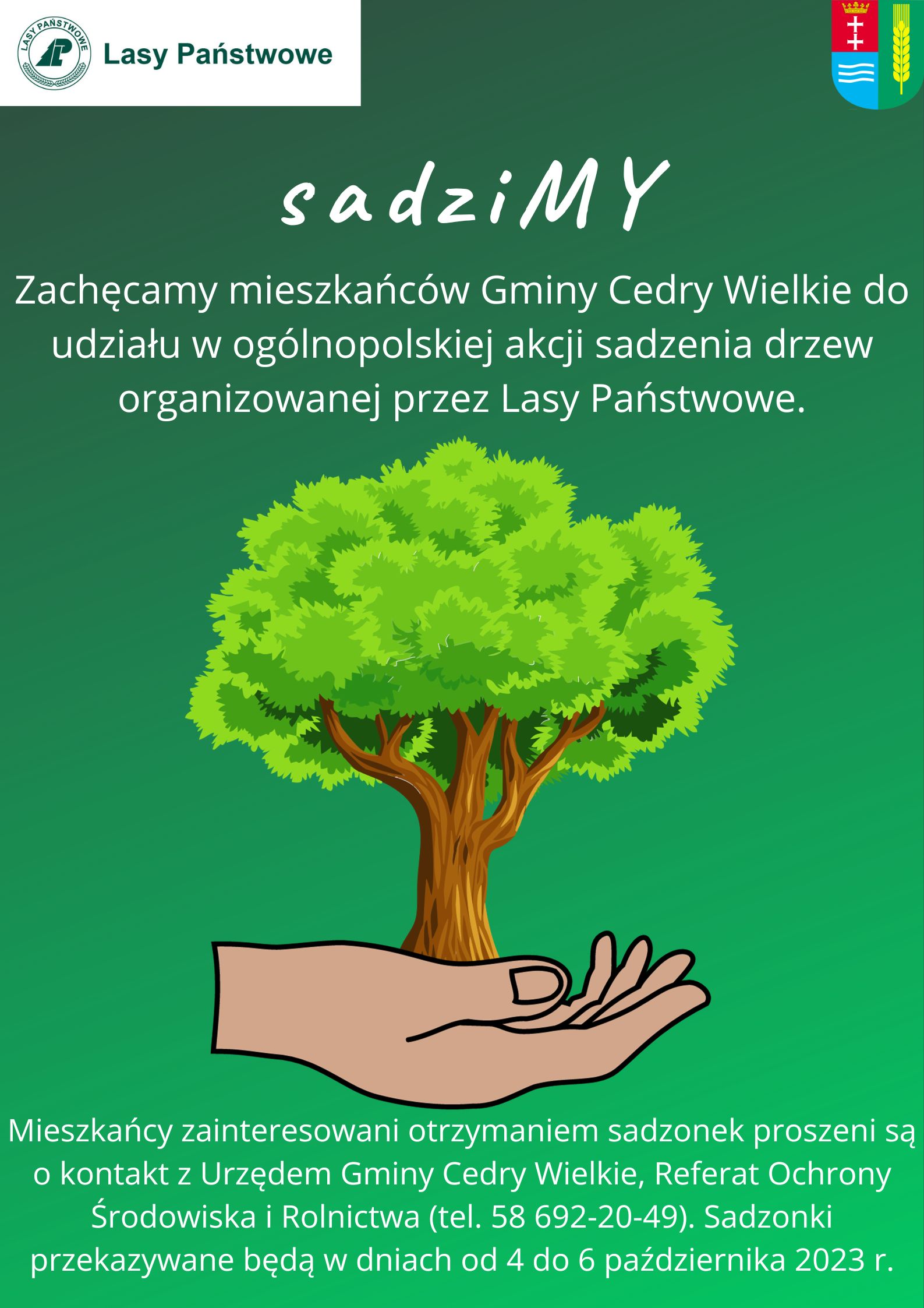 Zachęcamy mieszkańców do udziału w akcji sadzenia drzew. Osoby zainteresowane otrzymaniem sadzonek proszone są o kontakt z Urzędem Gminy Cedry Wielkie, Referat Ochrony Środowiska i Rolnictwa (tel. 58 692-20-49). Sadzonki wydawane będą w dniach od 4 do 6 października 2023 r.