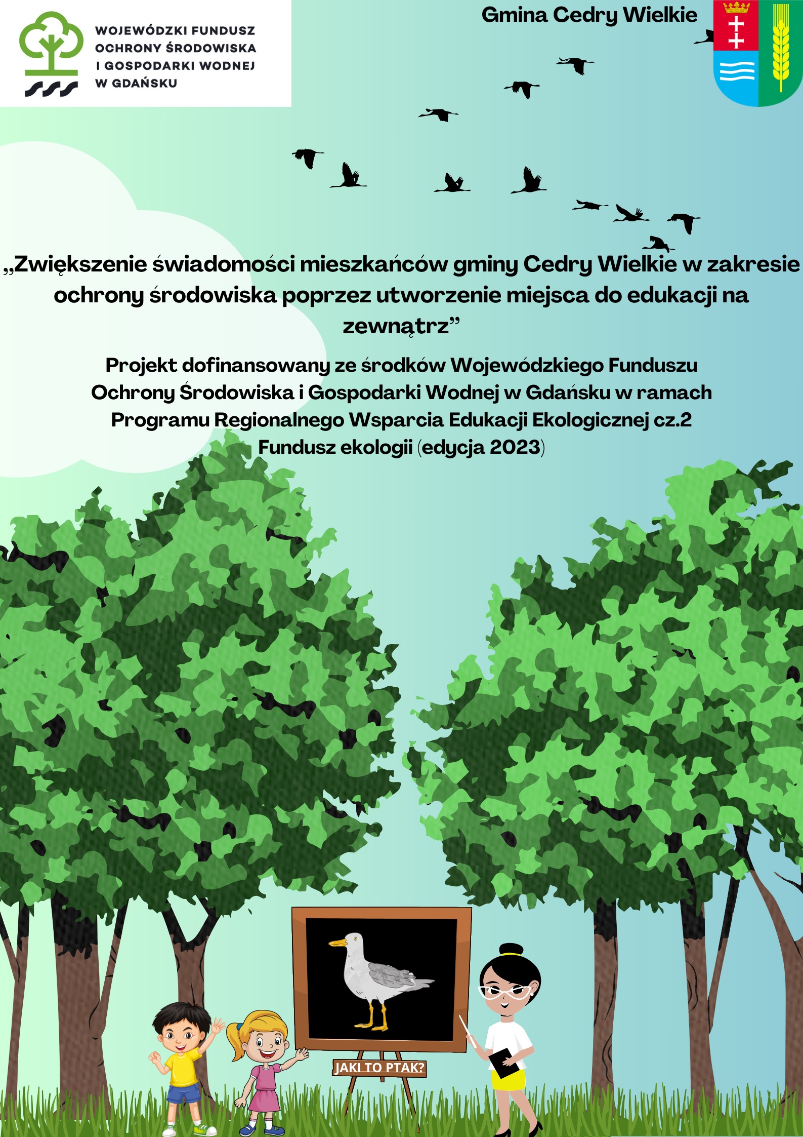 Kolejny ważny krok w kierunku zwiększenia świadomości ochrony przyrody poczyniono w naszej gminie. Dzięki środkom pozyskanym z Wojewódzkiego Funduszu Ochrony Środowiska i Gospodarski Wodnej w Gdańsku (8 tys. zł.) będzie można realizować projekt „Zwiększenie świadomości mieszkańców gminy Cedry Wielkie w zakresie ochrony środowiska poprzez utworzenie miejsca do edukacji na zewnątrz”.