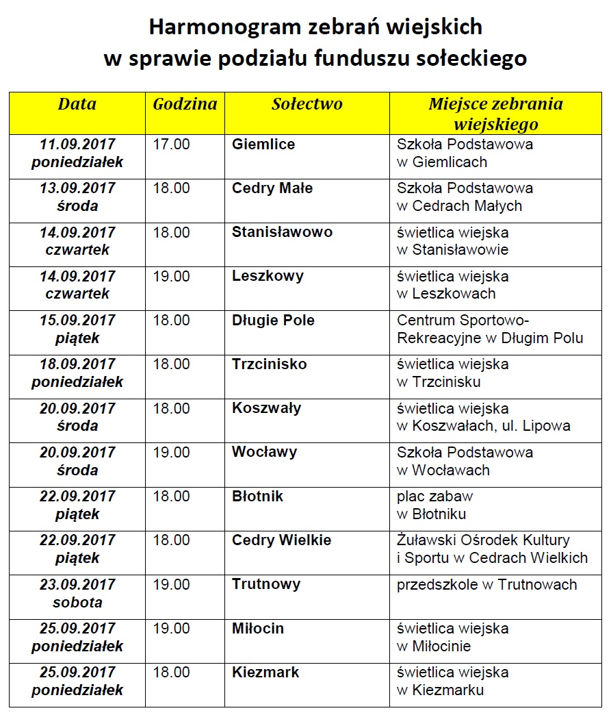 Sołtysi i Wójt Gminy Cedry Wielkie zapraszają mieszkańców do licznego udziału w zebraniach wiejskich poświęconych ustaleniu przeznaczenia środków funduszu sołeckiego na 2018 rok. Decyzje podejmowane corocznie przez mieszkańców w miesiącu wrześniu mają poważny wpływ na jakość ich życia. Przez ostatnie lata ze środków pochodzących z funduszy sołeckich wykonano wiele inwestycji oraz przedsięwzięć, poprawiających codzienny byt. Utwardzono drogi i je oświetlono. Postawiono wiaty przystankowe. Zakupiono sprzęt do utrzymywania terenów zieleni, kosze na śmieci, tablice ogłoszeniowe itp. Urządzono boiska i place zabaw. Dofinansowano wypoczynek dla dzieci oraz organizację imprez dla dzieci i dorosłych.