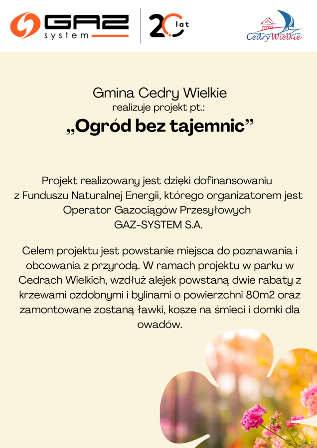 Projekt „Ogród bez tajemnic” ma na celu stworzenie parku w Cedrach Wielkich, który będzie służyć zarówno mieszkańcom, jak i osobom odwiedzającym stolicę naszej gminy. Będzie to idealne miejsce do odpoczynku oraz nauki o przyrodzie. W ramach projektu – wzdłuż ścieżek parku – powstaną rabaty, na których zostaną posadzone różnorodne krzewy ozdobne (berberysy, tawuły, funkie, forsycje oraz lawenda) oraz tulipany botaniczne i czosnek ozdobny.