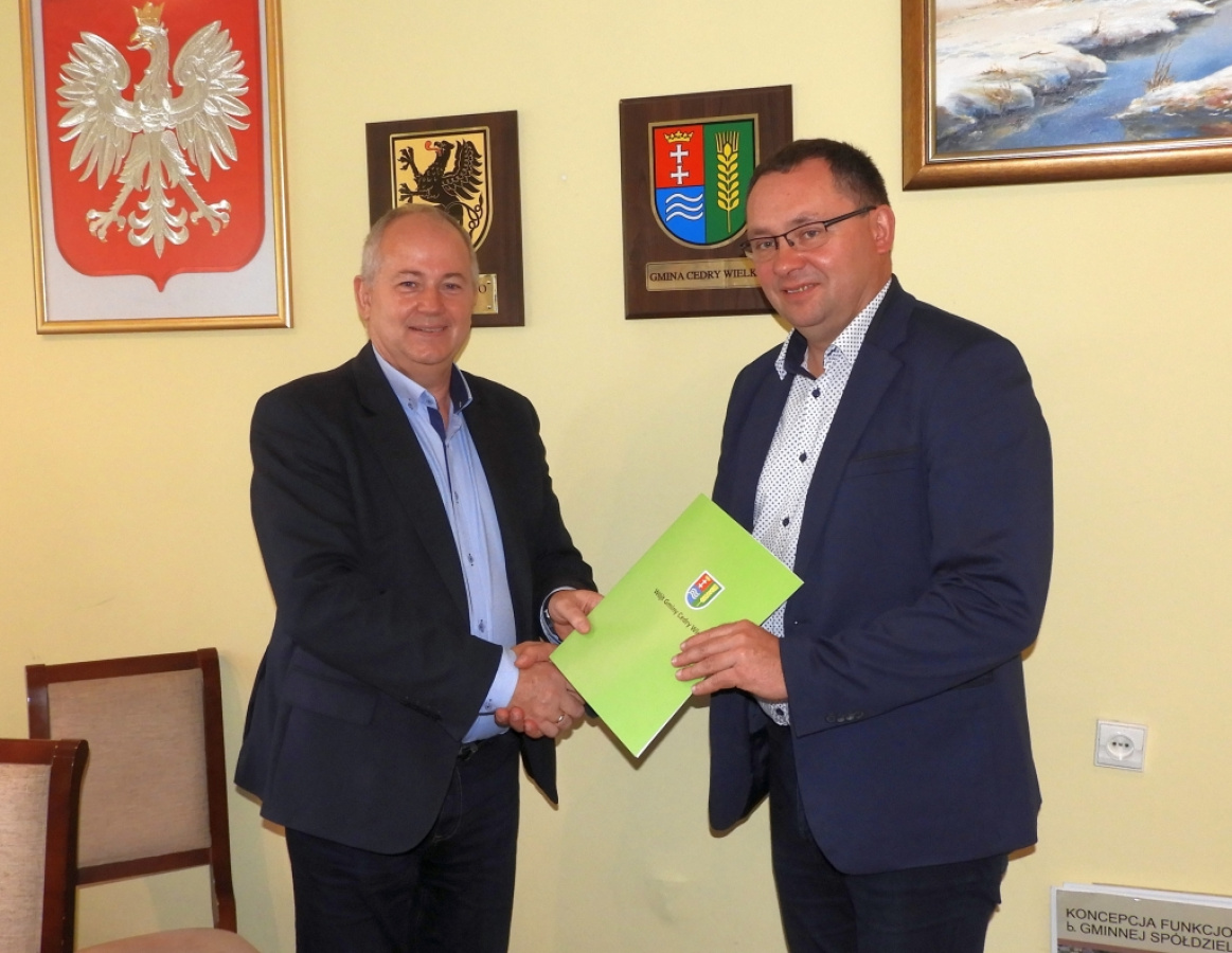 W dniu wczorajszym w Cedrach Wielkich została podpisana umowa pomiędzy Panem Januszem Golińskim - Wójtem Gminy Cedry Wielkie a Panem Mirosławem Ebertowskim - Wójtem Gminy Lipusz, na mocy której została przekazana dotacja celowa w wysokości 20 000,00 zł z przeznaczeniem na odtworzenie dróg gminnych zniszczonych w trakcie nawałnicy na terenie gm. Lipusz. Umowa ta jest konsekwencją podjętej przez Radnych Gminy Cedry Wielkie w dniu 24 sierpnia 2017 r. Uchwały w sprawie pomocy finansowej dla gmin, które ucierpiały w wyniku nawałnicy w nocy z 11 na 12 sierpnia br.