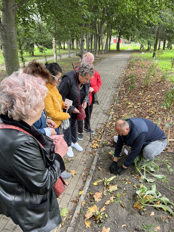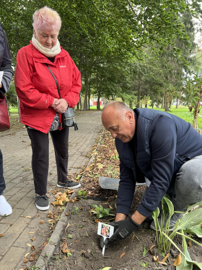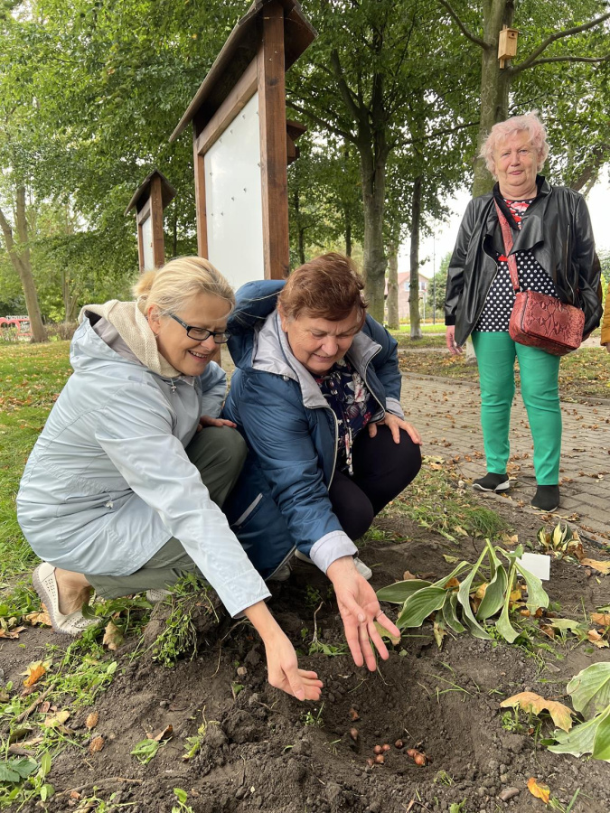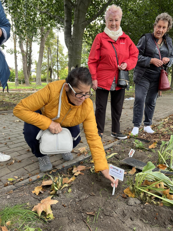 Wśród pierwszych gości „ogrodu bez tajemnic” znaleźli się również nasi seniorzy, którzy pomagali w sadzeniu tulipanów botanicznych. Dodajmy, że zasadzono cztery odmiany – łącznie ok. 200 cebulek. Uczestniczki akcji chętnie dzieliły się swoimi doświadczeniami związanymi oczywiście z uprawą i pielęgnacją kwiatów.