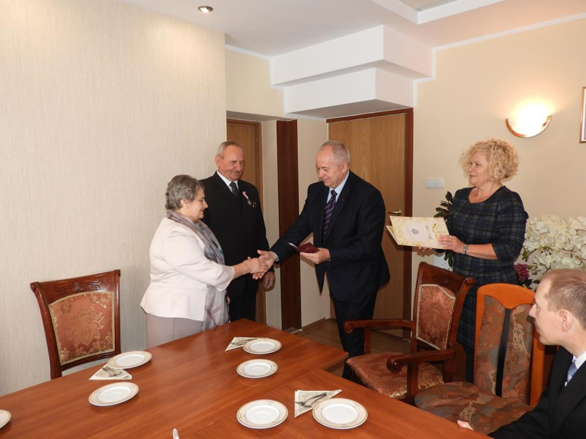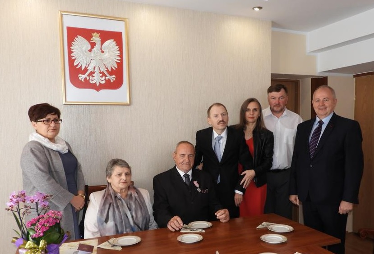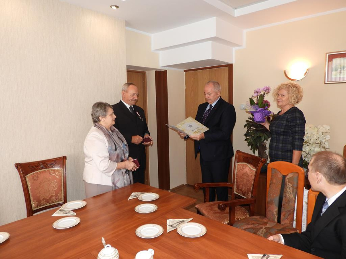 Małżonkom wręczone również zostały pamiątkowe legitymacje, upominek oraz bukiet kwiatów. Po oficjalnej części uroczystości, wzniesiony został toast za pomyślność Jubilatów oraz wykonano wspólne, pamiątkowe zdjęcie. Państwu Wołkowicz raz jeszcze gratulujemy 50-lat pożycia małżeńskiego oraz życzymy dużo zdrowia i długich lat życia w radości i pomyślności.