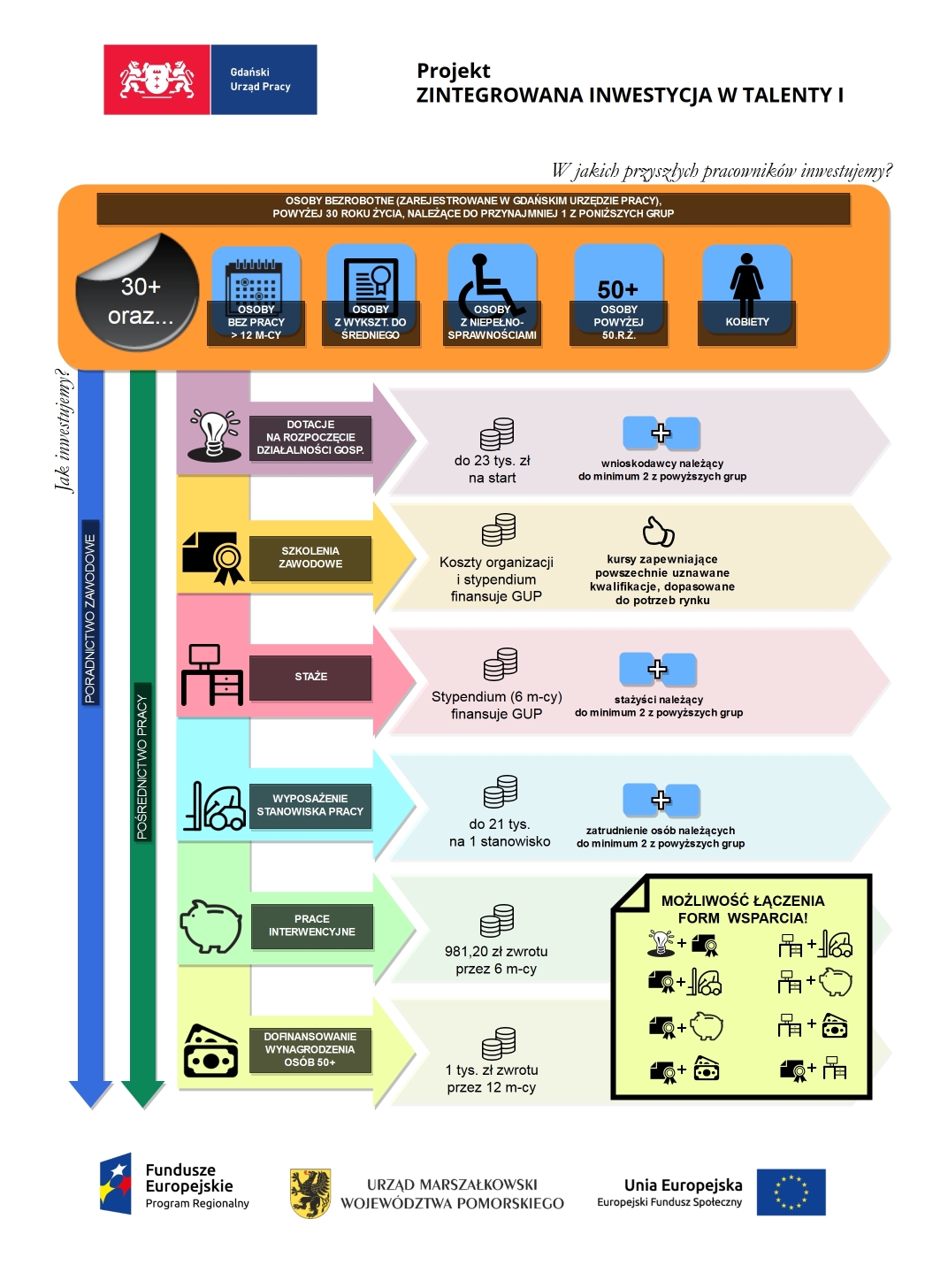 W 2017 roku Gmina Miejska Pruszcz Gdański wraz z Gdańskim Urzędem Pracy przystąpiła do realizacji projektu ,,Zintegrowana Inwestycja w Talenty I” (ZIT-I), dofinansowanego z Regionalnego Programu Operacyjnego Województwa Pomorskiego na lata 2014-2020. Projekt ukierunkowany jest na zwiększenie zatrudnienia osób bezrobotnych, znajdujących się w trudnej sytuacji na rynku pracy (po 30 roku życia oraz z wykształceniem średnim lub niższym). W ramach podejmowanych działań utworzono stanowisko doradcy ds. poradnictwa zawodowego i pośrednictwa pracy. Głównym zadaniem doradcy jest nawiązywanie kontaktów i współpracy z pracodawcami w zakresie m.in. pozyskiwania informacji o wolnych miejscach pracy. Przedstawia także dostępne oferty zatrudnienia spełniającym kryteria osobom bezrobotnym.