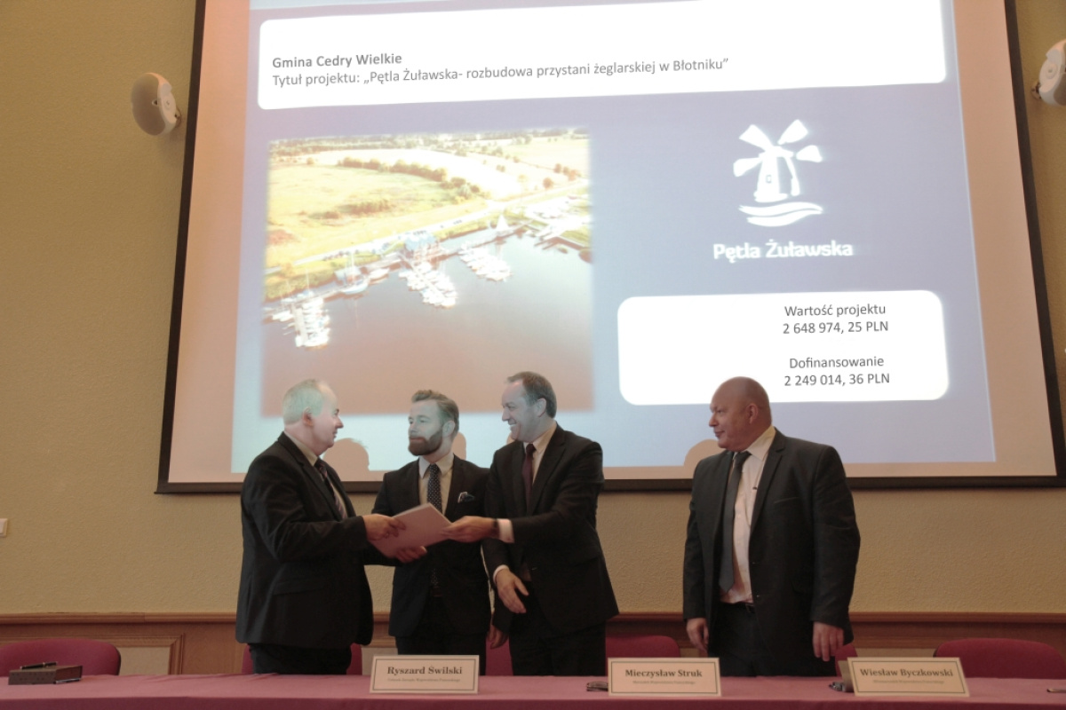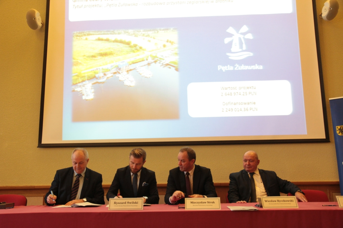 Dnia 11 grudnia br. w Filharmonii Bałtyckiej Pan Wójt Janusz Goliński podpisał z Zarządem Województwa Pomorskiego umowę na realizację inwestycji pn.: „Pętla Żuławska - rozbudowa portu jachtowego w Błotniku”. Koszt inwestycji to blisko 2,7 mln złotych z czego 2 249 014,36 zł stanowi dofinansowanie z Regionalnego Programu Operacyjnego dla Województwa Pomorskiego na lata 2014-2020 w ramach Działania 8.4 Wsparcie atrakcyjności walorów dziedzictwa przyrodniczego.