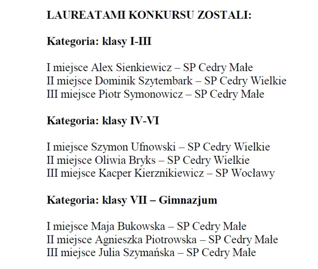 Laureaci zostali nagrodzeni pucharami, dyplomami i nagrodami rzeczowymi. Pozostali uczestnicy otrzymali słodki upominek oraz pamiątkowe dyplomy. Wszystkim uczestnikom serdecznie gratulujemy. Dziękujemy za przybycie i udział w konkursie.