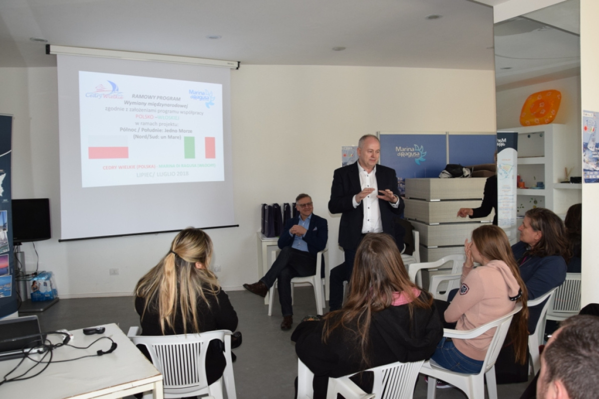 W czasie wizyty studyjnej zostały wymienione informację nt. dotychczasowej współpracy i strategii rozwoju edukacji i żeglarstwa w regionach Polski i Włoch, a także zaprezentowane najważniejsze punkty i obiekty związane z tą dyscypliną sportu. Zagadnienia w tym zakresie opracowane zostały i zaprezentowane przez przedstawicieli Urzędu Marszałkowskiego Województwa Pomorskiego Pana Adama Krawca - Dyrektora Departamentu Edukacji i Sportu, a także Pana Macieja Kowalczuka - Z-cę Dyrektora Departamentu ds. Sportu. Udział tak znaczących przedstawicieli z województwa pomorskiego jeszcze bardziej umocnił pozycję Gminy Cedry Wielkie jako solidnego i liczącego się partnera w działaniach partnerskich.