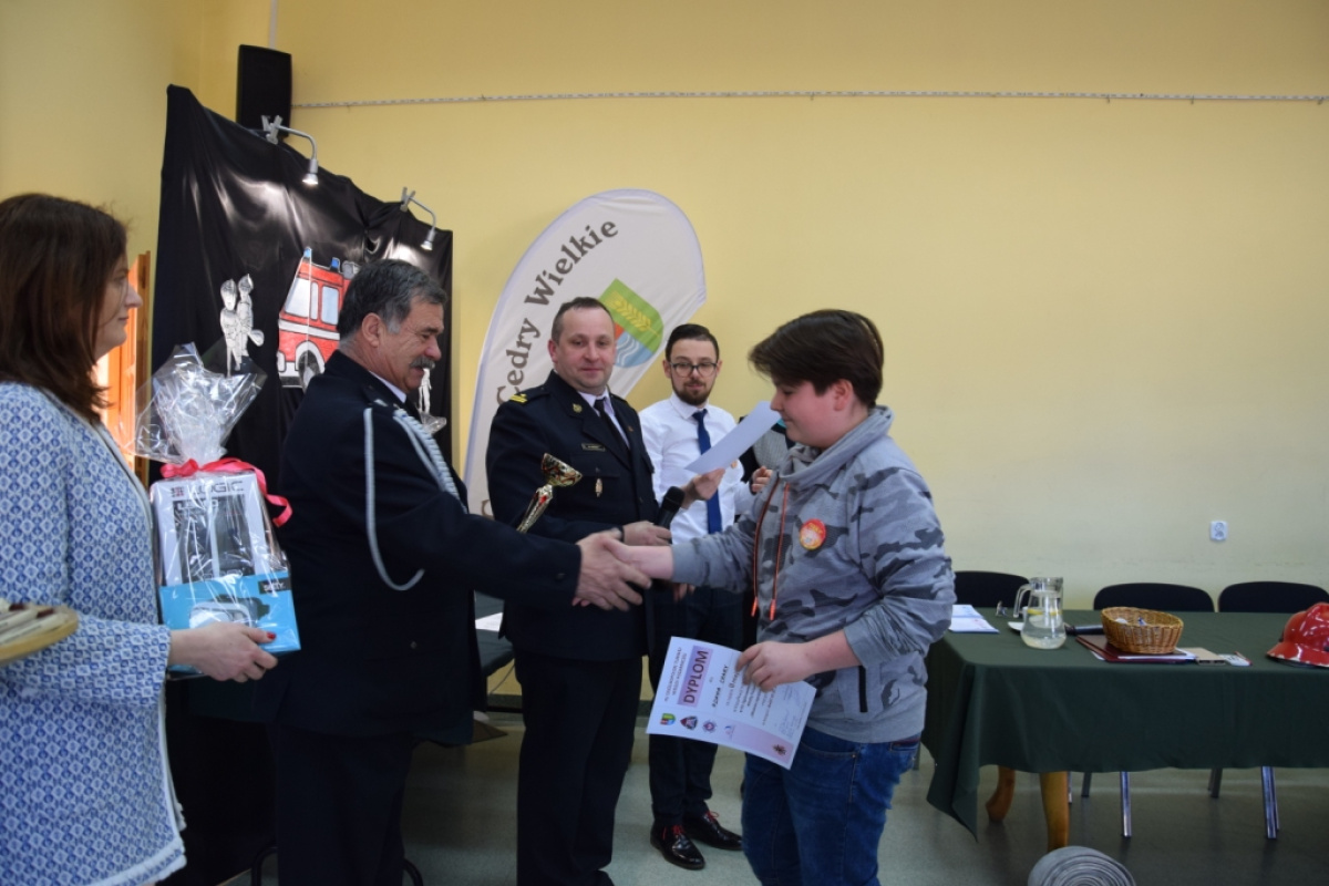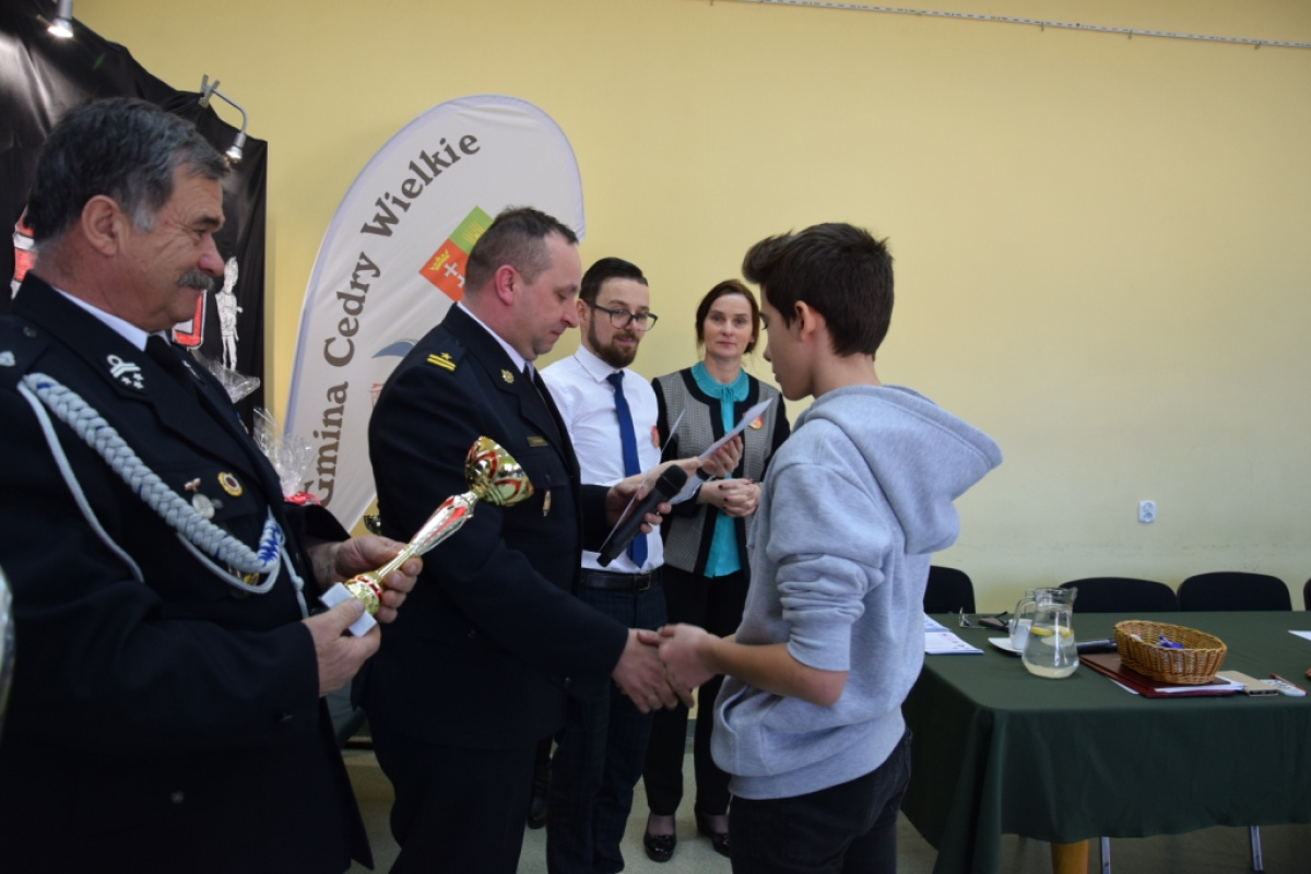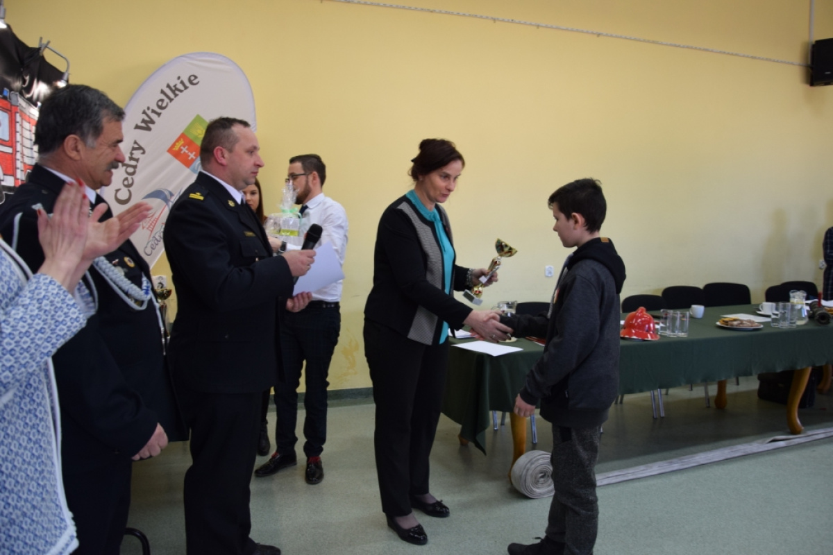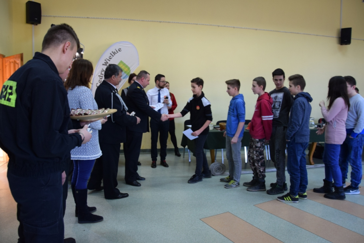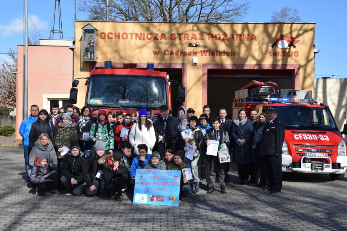 Dnia 21 marca 2018 roku w Żuławskim Ośrodku Kultury i Sportu w Cedrach Wielkich odbyły się gminne eliminacje do XLI Ogólnopolskiego Turnieju Wiedzy Pożarniczej „Młodzież zapobiega pożarom”. Były to już dziewiąte eliminacje organizowane na terenie gminy Cedry Wielkie. W konkursie licznie wzięły udział dzieci i młodzież ze wszystkich szkół: Giemlic, Wocław, Cedrów Małych i Cedrów Wielkich. Na wszystkich uczestników czekały statuetki za udział oraz dyplomy, a dla zwycięzców nagrody rzeczowe i puchary, które zostały ufundowane przez Pana Janusza Golińskiego - Wójta Gminy Cedry Wielkie. Celem konkursu jest popularyzowanie wśród dzieci i młodzieży znajomości przepisów przeciwpożarowych, zasad postępowania na wypadek pożaru, wiedzy na temat technik pożarniczych, organizacji ochrony przeciwpożarowej oraz historii i tradycji samej straży pożarnej.