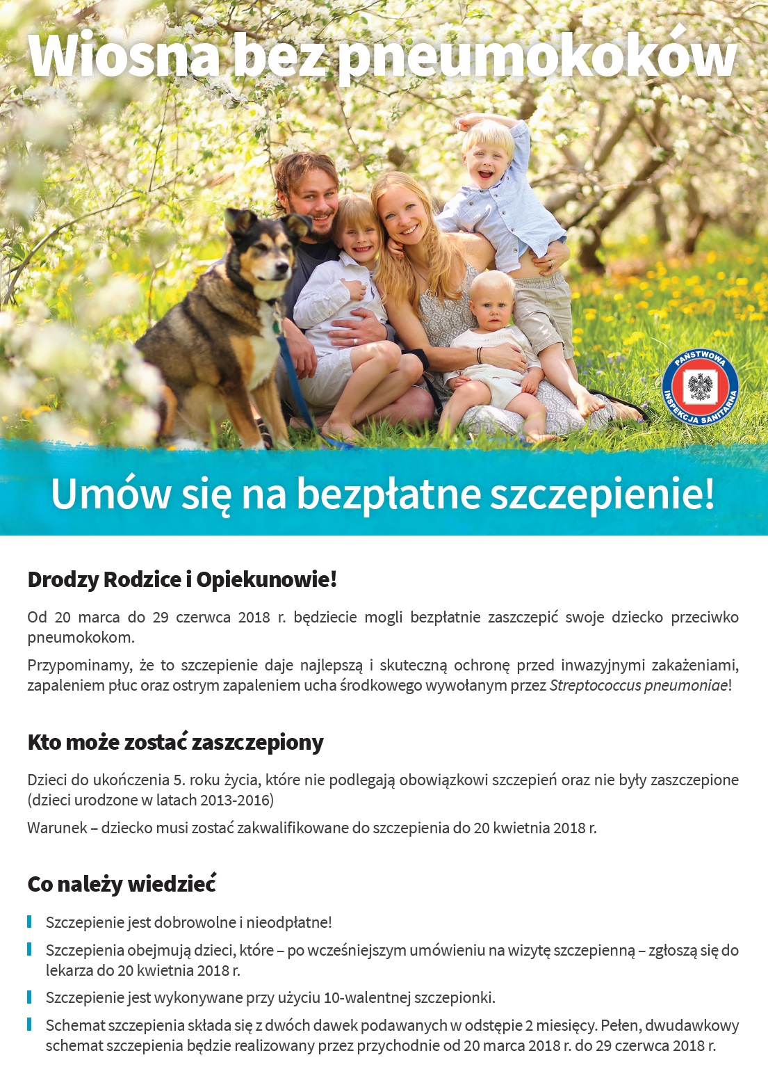 Państwowy Powiatowy Inspektor Sanitarny w Pruszczu Gdańskim uprzejmie informuje, iż w okresie od 20 marca do 29 czerwca 2018 r. na terenie województwa pomorskiego przeprowadzana jest akcja „WIOSNA BEZ PNEUMOKOKÓW". W ramach tego programu rodzice będą mogli bezpłatnie zaszczepić swoje dzieci przeciwko pneumokokom. Szczepionka jest przeznaczona dla dzieci do 5 roku życia, które nie były szczepione.
