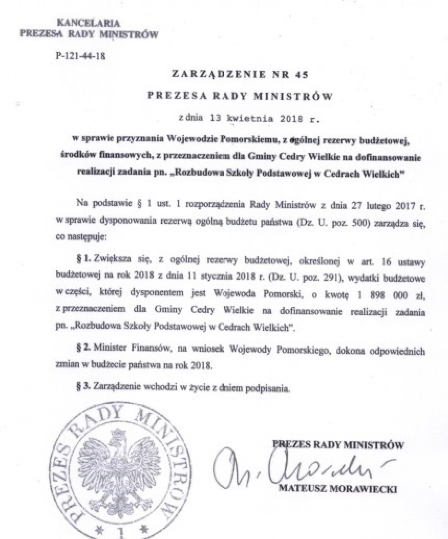 1 898 000 złotych - to kwota, która zostanie przekazana gminie Cedry Wielkie na dofinansowanie rozbudowy Szkoły Podstawowej w Cedrach Wielkich. Minister Finansów, na wniosek Wojewody Pomorskiego Dariusza Drelicha, dokona odpowiednich zmian w budżecie państwa na rok 2018. Zarządzenie podpisał Premier Mateusz Morawiecki. Prace pochłoną ponad 6 mln zł, a ich efekt ma być gotowy w kwietniu 2019 roku. Obecnie wykonywane są prace związane z zakończeniem szalowania i zbrojenia podciągów i stropów żelbetowych, zbrojenie i zalanie kolejnej wysokości szybu windowego, izolacji pionowych zewnętrznych ścian fundamentowych budynku.