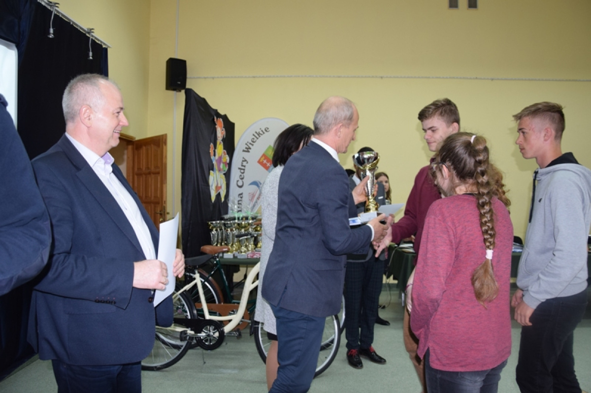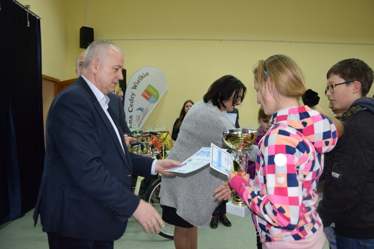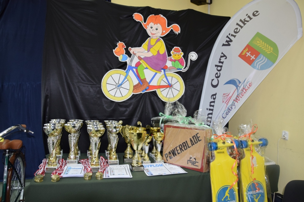 Na zwycięzców czekały atrakcyjne nagrody: rowery, łyżworolki, longboardy. Wszyscy uczestnicy otrzymali pamiątkowe medale i słodkie upominki. Zwycięskie drużyny otrzymały puchary. Natomiast najlepsi zawodnicy w klasyfikacji indywidualnej otrzymali dyplomy i nagrody rzeczowe ufundowane przez Starostwo Powiatowe w Pruszczu Gdańskim oraz Wójta Gminy Cedry Wielkie. Zwycięskie drużyny w kategorii szkoła podstawowa i gimnazjum reprezentować będą Powiat Gdański w eliminacjach wojewódzkich. Laureatom gratulujemy i życzymy powodzenia w dalszych zmaganiach !