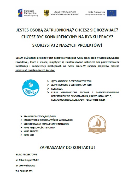 Celem Głównym projektów jest poprawa sytuacji na rynku pracy osób w wieku aktywności zawodowej, które z własnej inicjatywy są zainteresowane nabyciem lub podwyższeniem kwalifikacji kompetencji niezbędnych na rynku pracy. W ramach projektów możesz skorzystać z atrakcyjnych kursów.
