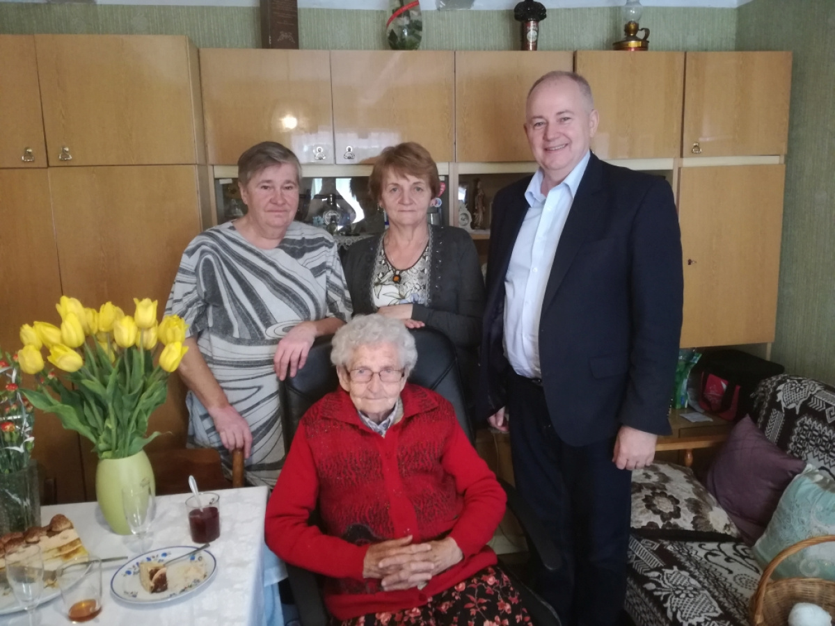 Pani Genowefa Budzyń mieszkanka Cedrów Małych obchodziła 92 rocznicę urodzin. Z tej okazji Wójt Gminy Cedry Wielkie Pan Janusz Goliński wraz z Kierownikiem Gminnego Ośrodka Pomocy Społecznej w Cedrach Wielkich Panią Grażyną Bereza udali się do Jubilatki z kwiatami oraz okolicznościowym prezentem składając najserdeczniejsze życzenia w imieniu własnym oraz mieszkańców.
