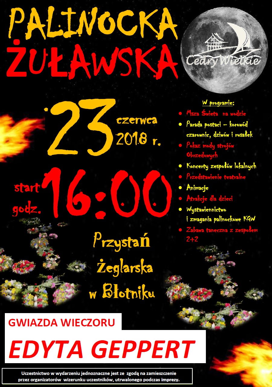Gmina Cedry Wielkie zaprasza w dniu 23 czerwca 2018 r. na Przystań Żeglarską w Błotniku na imprezę pn: "PALINOCKA ŻUŁAWSKA". W tradycji Noc Świętojańska jest świętem wody i ognia, słońca i księżyca. Zaplanowane wydarzenie będzie miało charakter ponadregionalny i stanowić będzie wizytówkę podejmowanych przez Gminę działań w zakresie kultury i sportu. Impreza rozpocznie się Mszą Świętą na wodzie o godz. 15.30. Następnie parada w postaci korowodu czarownic, dziwów , nimf wodnych przejdzie na główne miejsce uroczystości na plac obok przystani.