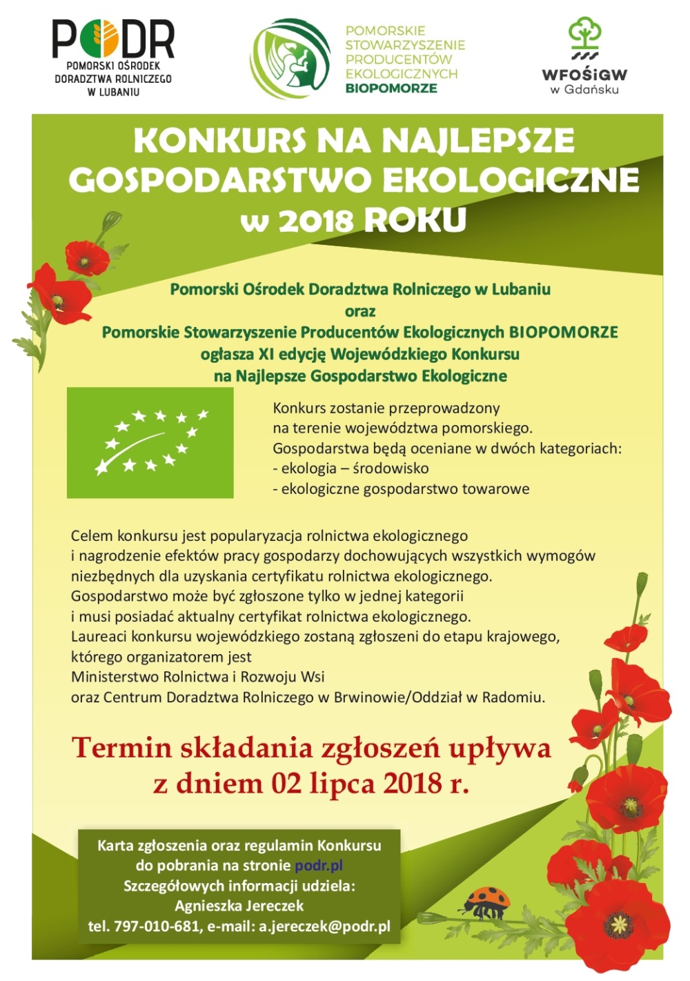 Pomorski Ośrodek Doradztwa Rolniczego w Lubaniu oraz Pomorskie Stowarzyszenie Producentów Ekologicznych BIOPOMORZE ogłasza XI edycję Wojewódzkiego Konkursu na Najlepsze Gospodarstwo Ekologiczne. Konkurs zostanie przeprowadzony na terenie województwa pomorskiego.